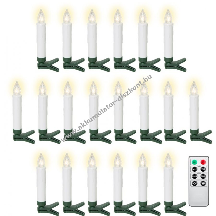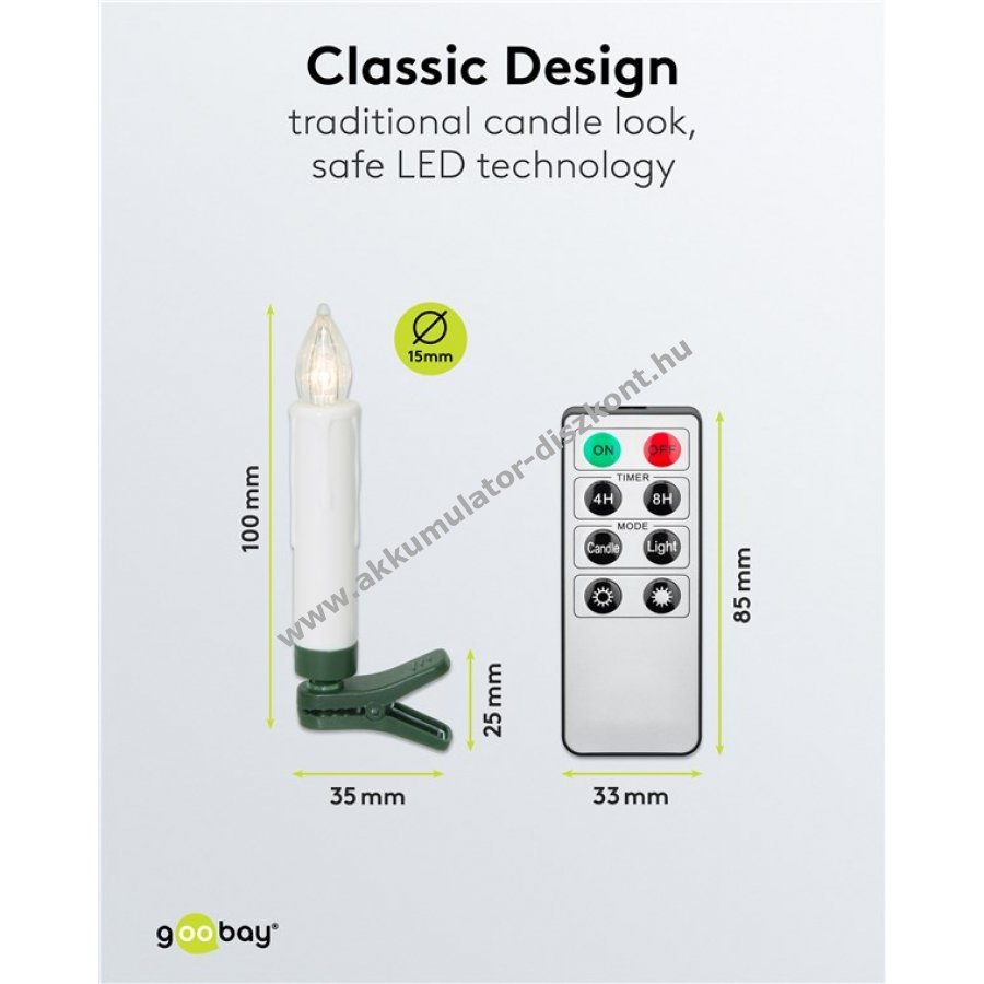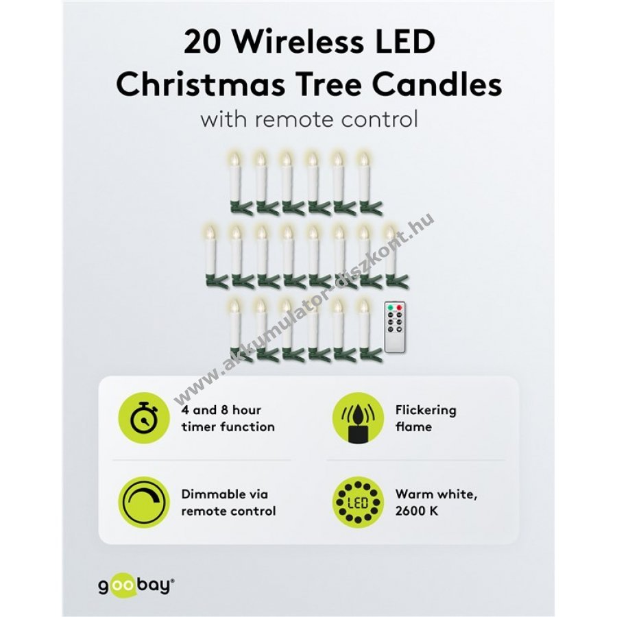 Elemmel működik: gyertyákhoz 1x AAA (nem tartozék) távirányítóhoz 1x CR2025 (tartozék).