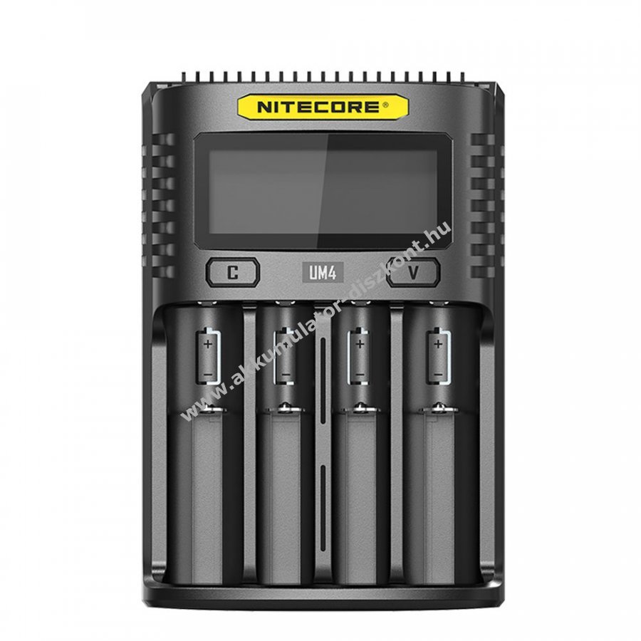 Eredeti Nitecore UM4 akkumulátortöltő Li-Ion, Li-Ion IMR, NiMH, NiCd és mások számára. LiFePO4 akkumulátorok! Ez az eredeti Nitecore töltő 4 töltőnyílással, felismeri az akkumulátor típusát, meghatározza az akkumulátor állapotát, az akkumulátor töltöttségi szintjét, és így automatikusan beállítja a helyes töltési módot. Az UM4 segítségével mélyen lemerült Li-Ion akkumulátorok újraaktiválhatók. (FIGYELEM: Kérjük, vegye figyelembe a használati útmutatót!) teljes teljesítmény 3000mA (1500mA-os teljesítménnyel) LCD-kijelző USB töltőport speciálisan optimalizált töltési program IMR akkumulátorokhoz Műszaki adatok: Bemeneti feszültség: DC 5 V / 2A 9 V / 2A 18 W (max.) Kompatibilitás: Li-Ion, IMR, LiFePO4: 10440, 14500 , 14650, 16500, 16340 (RCR123), 16650, 17350, 17500, 17650 17670, 17700, 18350, 18490, 18500, 1860, 18700, 20700, 21700, 22500, 26500, 26650, 26700 NiMH / NiCd: AA, AAA, AAAA, C, D