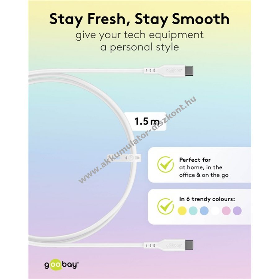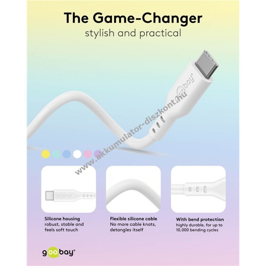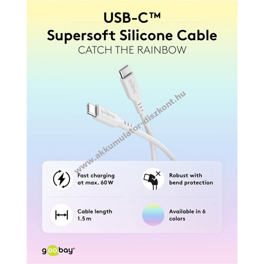USB-C töltőkábel a Power Delivery segítségével történő szupergyors töltéshez, akár 60W teljesítménnyel. Adatátvitelre is tökéletes: az USB-C kábel akár 480 Mbit/s (USB 2.0) sebességű nagysebességű adatátvitelt biztosít. A bársonyosan puha szilikon kábelburkolat kellemes tapintású és kíméletes az érzékeny felületekkel A gyors töltésű kábel szilikon burkolata nagy rugalmasságának és beépített hajlításvédőjének köszönhetően hatékonyan megakadályozza a kábel összegabalyodását és törését Az USB-CUSB-C kábel sima felületének köszönhetően gyorsan és egyszerűen tisztítható Szilikon kábelkötegelőkkel együtt, amelyekkel a használat után biztonságosan és szépen össze lehet kötni az USB-C kábelt.