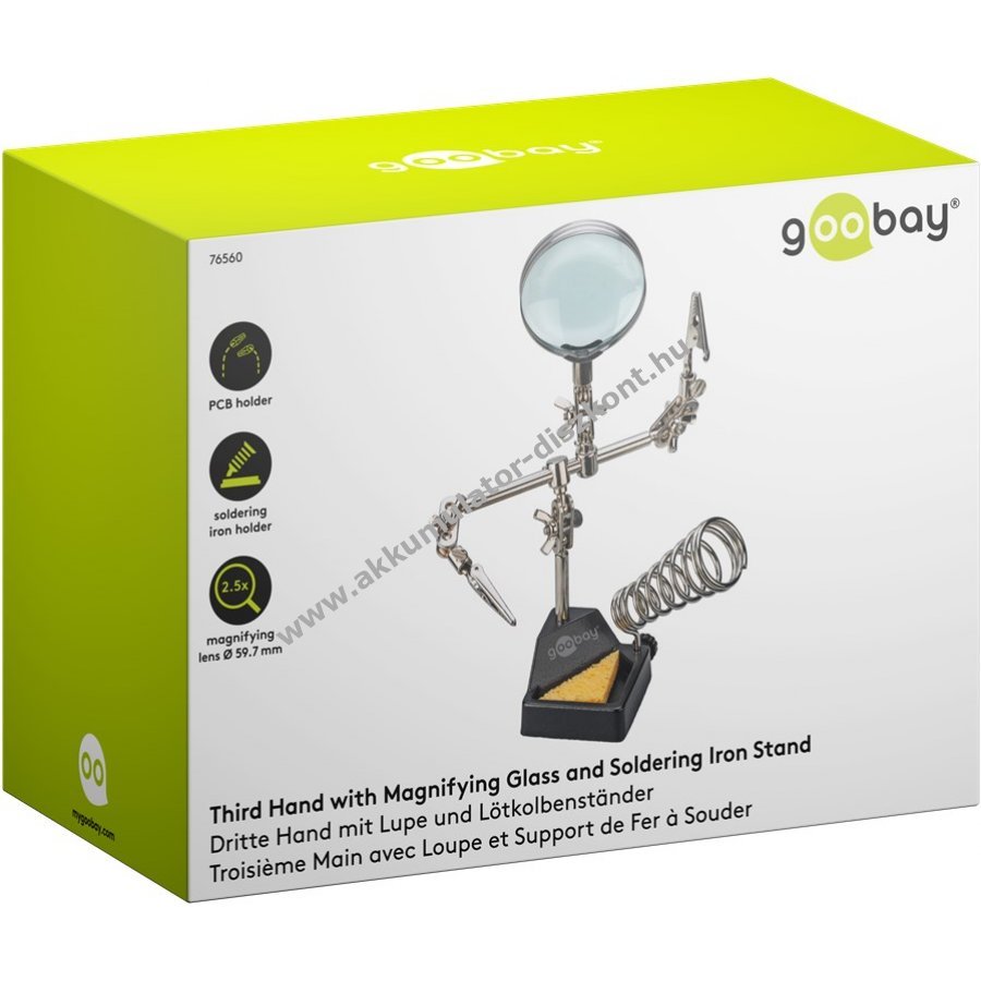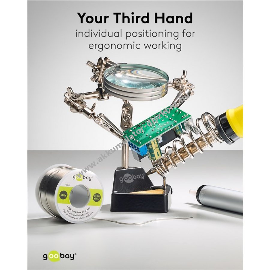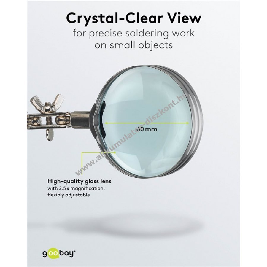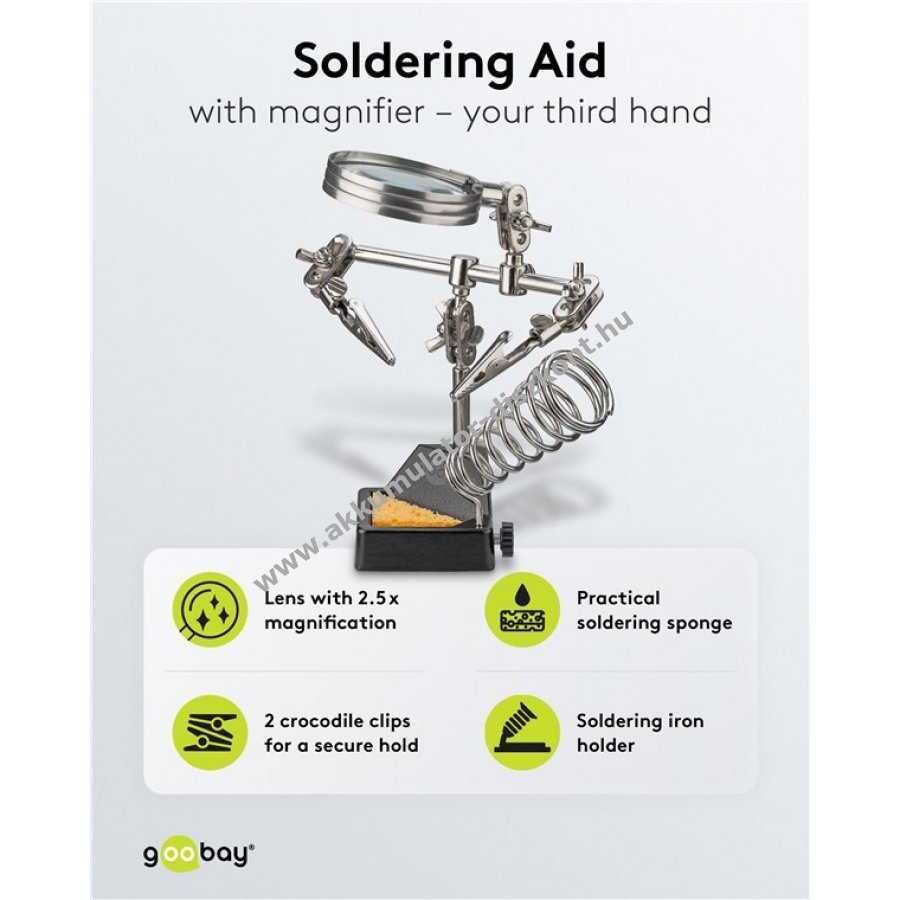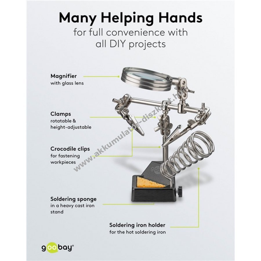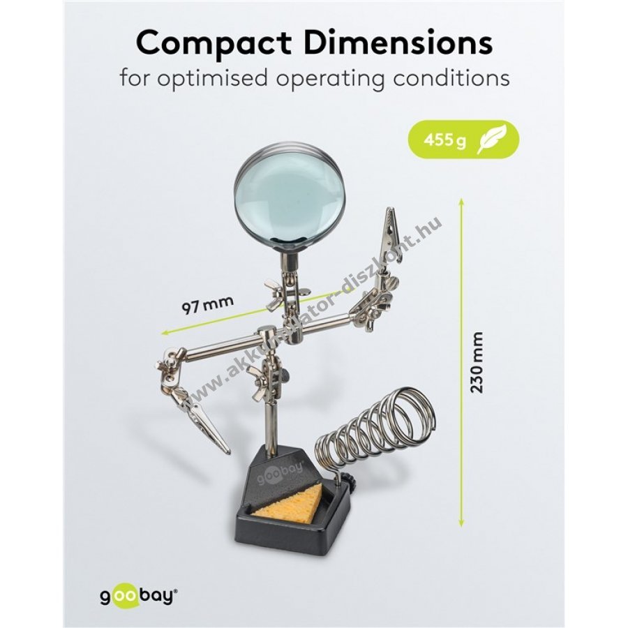 Kompakt segédeszköz precíz forrasztási és barkács munkákhoz. Stabil krokodilcsipeszek biztosítják a munkadarab rögzítését és mindkét kéz szabadon marad a pontos munkához. Egyszerű beállítás és precíz munka minden profi és barkácsoló számára. 360°-ban forgatható krokodilcsipeszek a biztonságos tartásért. 26,5 cm-es karhossz a csipeszekkel együtt. Rugalmas gömbcsuklók és szárnyas anyák a pontos pozícionáláshoz. Üveg lencsés nagyító 60 mm átmérővel és 2,5-szeres nagyítással a részletes munkához. Forrasztópáka tartó a forró páka biztonságos elhelyezéséhez. Forrasztó szivacs a hegy gyors tisztításához munka közben. Masszív öntöttvas talp stabil tartást biztosít. Teljes tömeg 455 g.