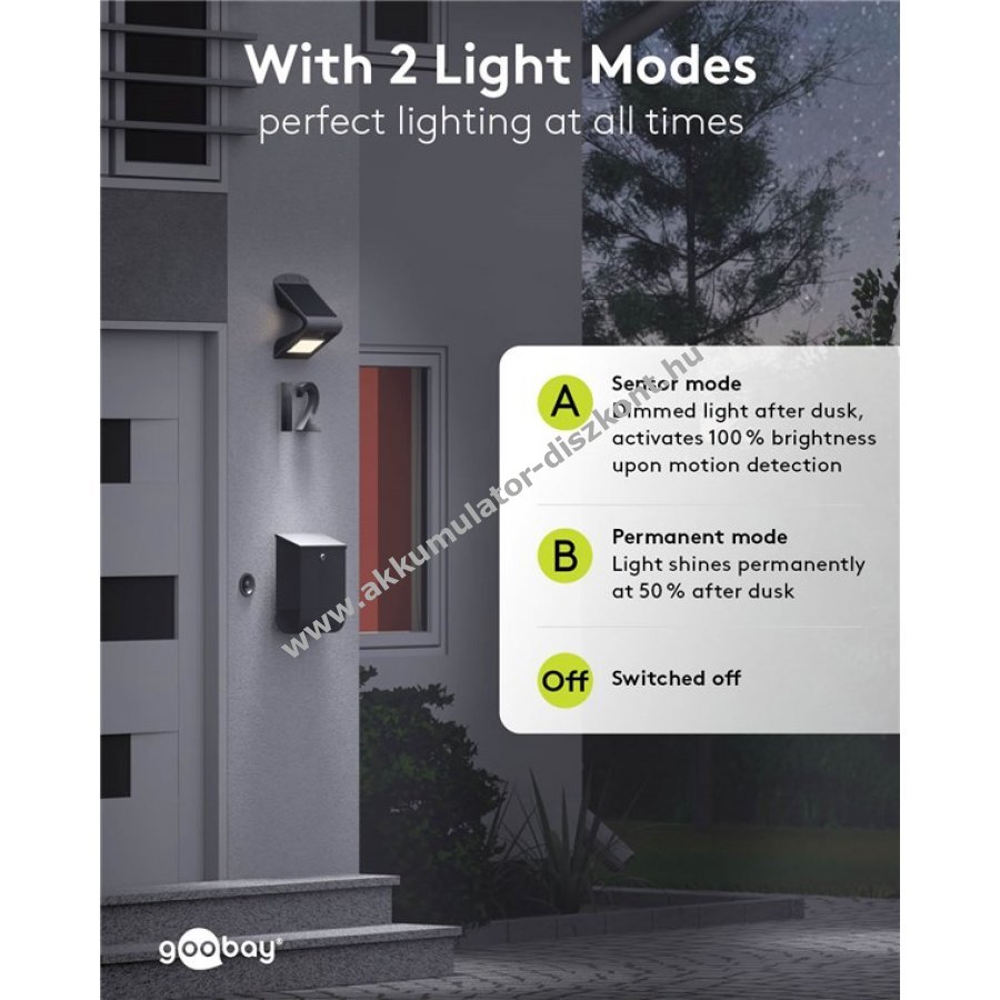 Vezeték nélküli napelemes fali lámpa kültéri használatra mozgásérzékelővel a biztonságos megvilágításhoz kertben carportnál vagy bejáratnál 2 fénymóddal állítható folyamatos vagy mozgásra kapcsoló fény 90° sugárzási és 120° érzékelési szöggel 18650 Li-ion akkumulátorral 3,7V 2000mAh akár 30 óra világítási idő 54 elülső LED 500 lumen semleges fehér fényt ad 2 hátsó LED indirekt világítást biztosít 2-4 m ajánlott felszerelési magasság 7 m hatótávolság maximális magasságnál Egyszerű falra szerelés három csavarral szerelési anyaggal