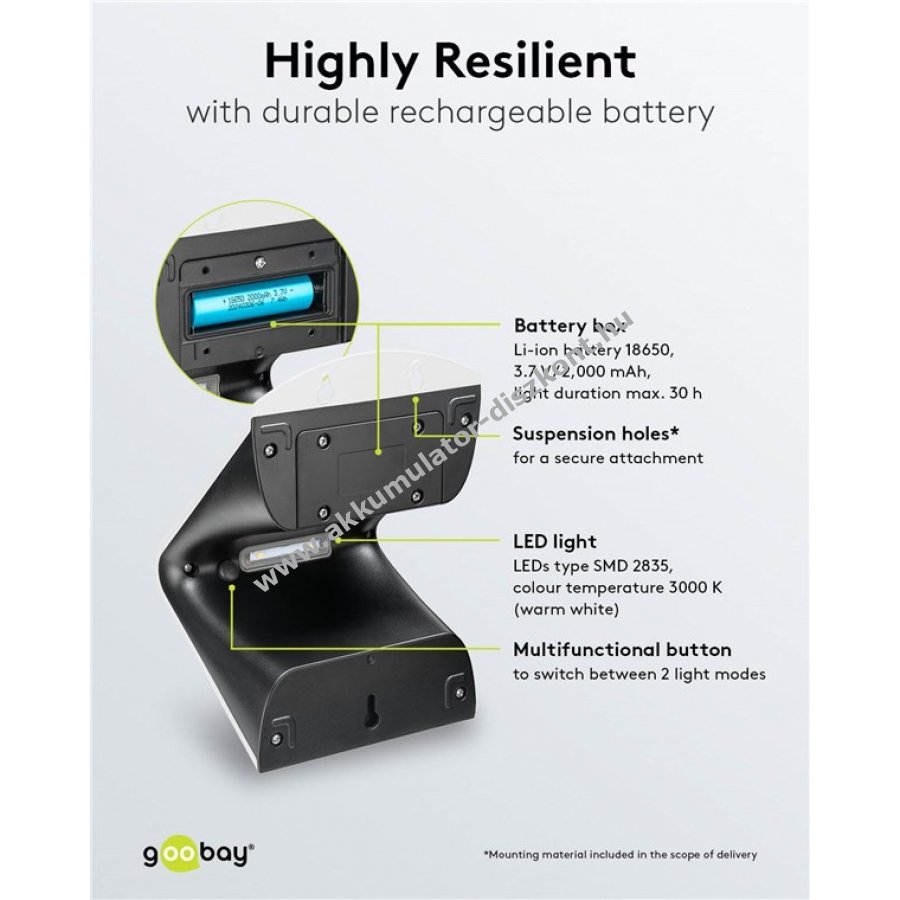 A napelem és a 3,7V 2000mAh Li-ion akkumulátor biztosítja az energiaellátást akár 30 órás működéssel.