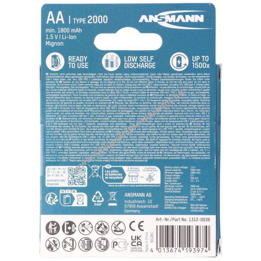 1.5V 2000mAh/3.26Wh Li-Ion 14,5mm x 50,5mm Ansmann