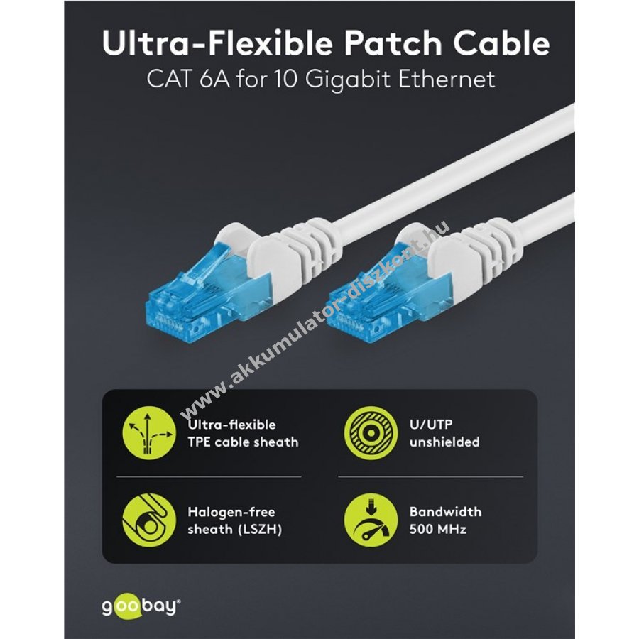 Ultrarugalmas CAT 6A patchkábel puha TPE külső burkolattal a könnyű kezelhetőségért és hatékony LSZH védelemért. 2x RJ45 csatlakozóval hálózati eszközök összekapcsolásához otthon, irodában vagy szerver szekrényben. Alkalmas 10-Gigabit Ethernet hálózatokhoz 10BASE-T, 100BASE-TX, 1000BASE-T, 10/100/1000/10000 Mbit/s sebességgel. Magas minőségű réz vezető és 3 µm aranyozott érintkezők biztosítják a megbízható kapcsolatot. A vékony, törésvédett Slimline burkolaton megtalálható a kábel hossza. Az RJ45 csatlakozó reteszvédővel ellátott a sérülések elkerülésére. Tűzvédelmi szabványoknak megfelelő LSZH burkolat alacsony füstképződéssel és halogénmentességgel. Kompatibilis Power over Ethernet (PoE, PoE+) használatra.