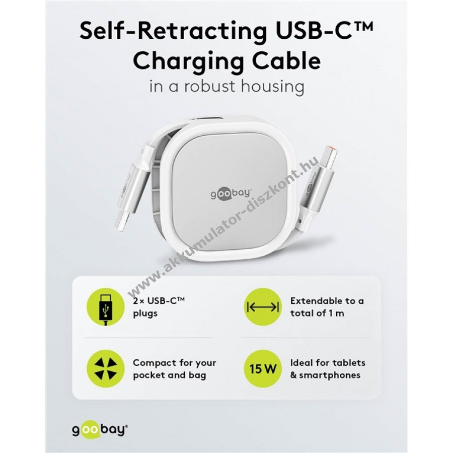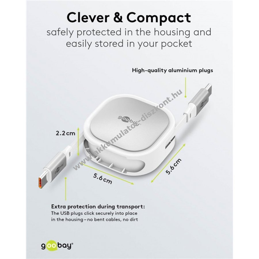 5 fokozatban állítható: az USB-kábel öt különböző hosszúságra nyújtható, ha egyszerre húzza meg a kábel mindkét végét.Praktikus visszahúzó mechanizmus: a kábel végeinek ismételt meghúzása automatikusan elindítja a visszahúzó funkciót.Biztonságos szállítás kiálló csatlakozók nélkül: az USB-csatlakozók laposan illeszkednek a tokba, hogy megvédjék őket a portól, a szennyeződésektől és a kábelek törésétől. 15 W-os töltési teljesítményével az USB-C kábel ideális kis eszközökhöz, például okostelefonokhoz, fejhallgatókhoz vagy táblagépekhez.
