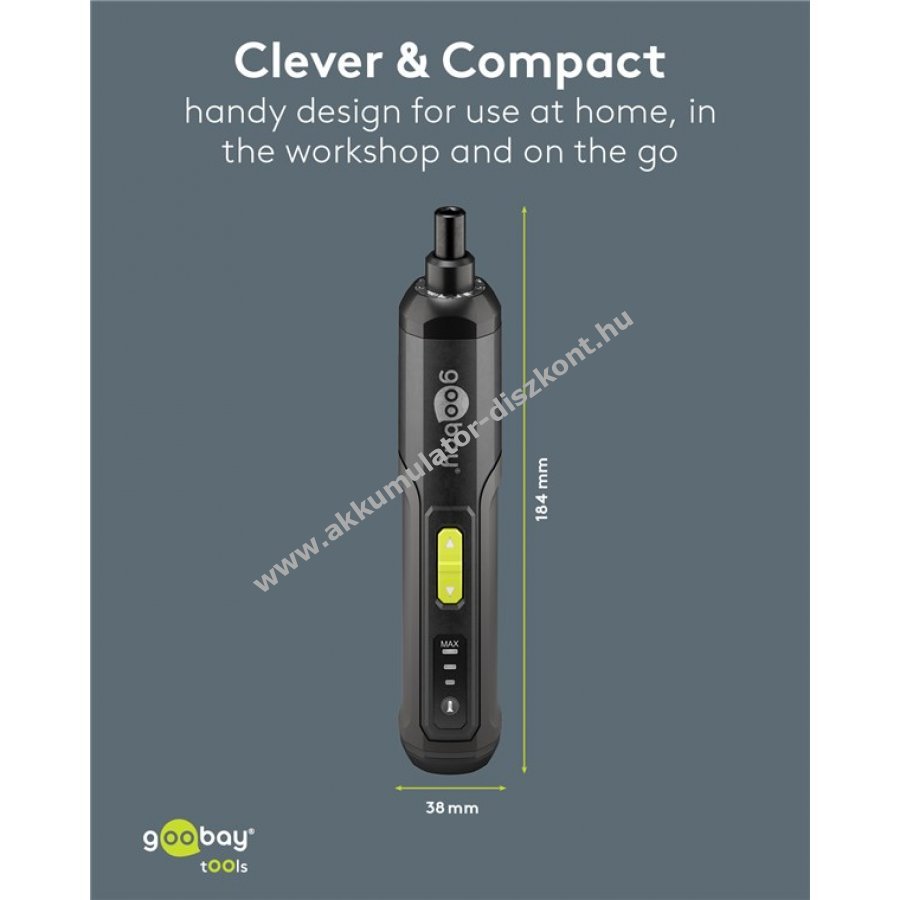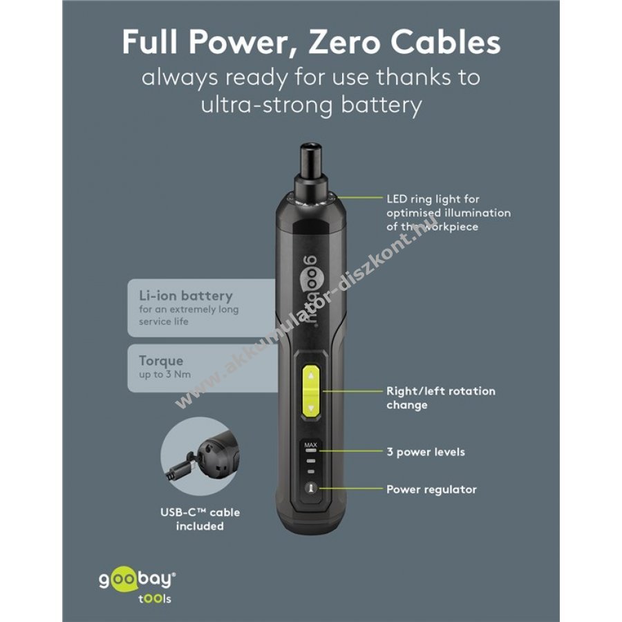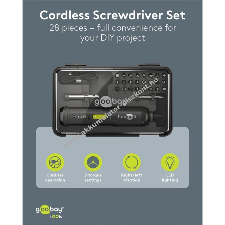Kompakt és kézreálló mini akkus csavarozó praktikus készletben otthoni és hobbi használatra. 3 fokozatú nyomatékszabályozás 1 Nm 2 Nm vagy 3 Nm mindkét irányban. Integrált előlapi LED világítás a jobb láthatóságért. Gumírozott markolat kényelmes fogást biztosít hosszabb munkák során. 24 bit különböző típusokkal 4 lapos 8 kereszt 4 hatszög 4 négyszög 4 belső hatszög plusz 1 kereszt bit 50 mm hosszban. 1 bit hosszabbító 60 mm hosszú. Kompakt műanyag doboz átlátszó fedéllel a könnyű tárolásért. USB-C-USB-A kábel 0,5 m hosszú a lítium-ion akkumulátor töltéséhez.