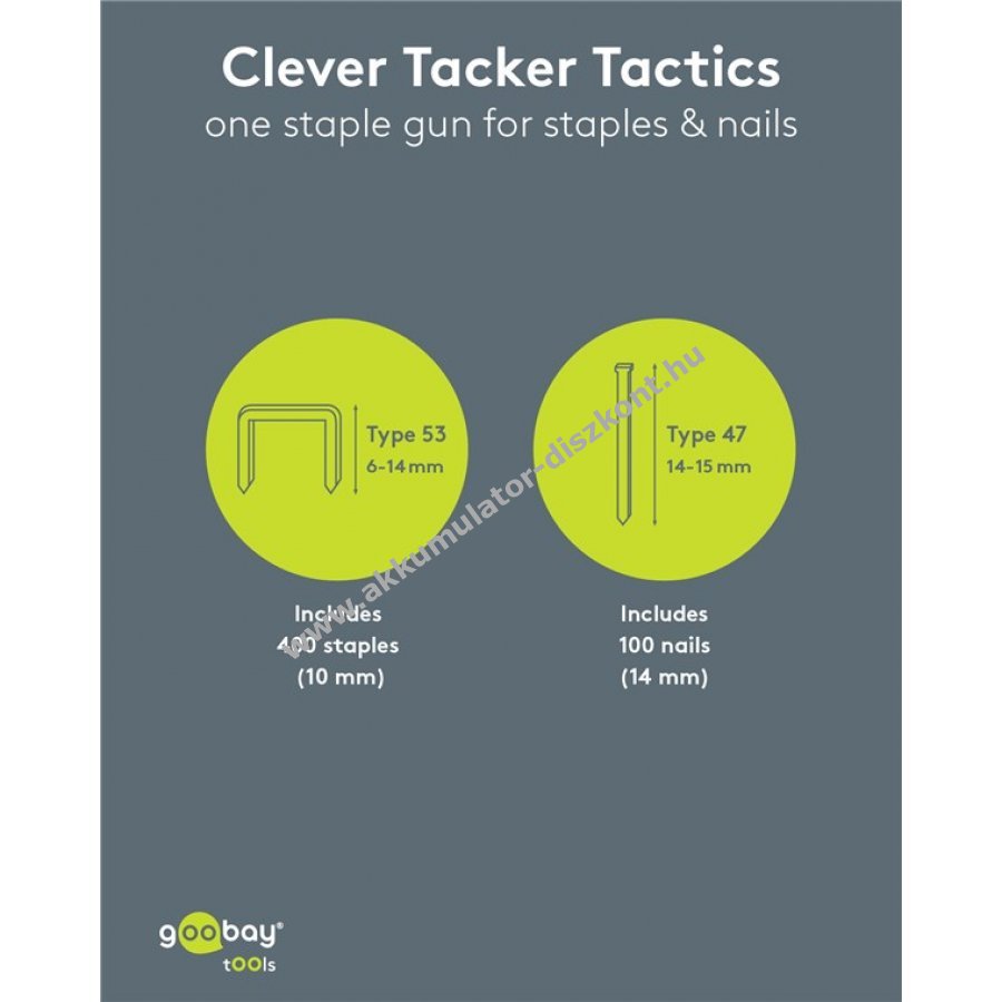 - Tartozék: 400 db 10 mm-es kapocs és 100 db 14 mm-es szeg