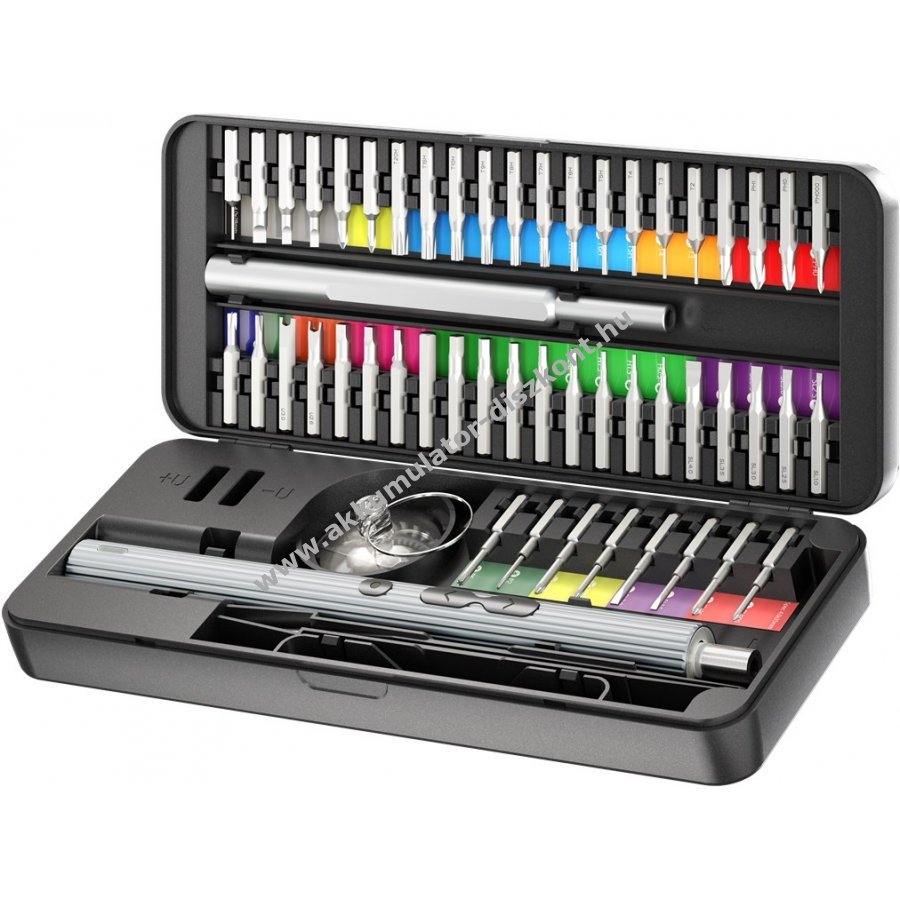 A készlet 50 bitet tartalmaz 28 mm és 35 mm hosszban különböző típusokban: 8x kereszt, 11x belső hatszög, 9x hatszög, 7x lapos, 1x 5-pontos, 4x tri-wing, 3x háromszög, 3x négyszög, 2x U-típusú, 1x fához való fúró, 1x átfúrótű.