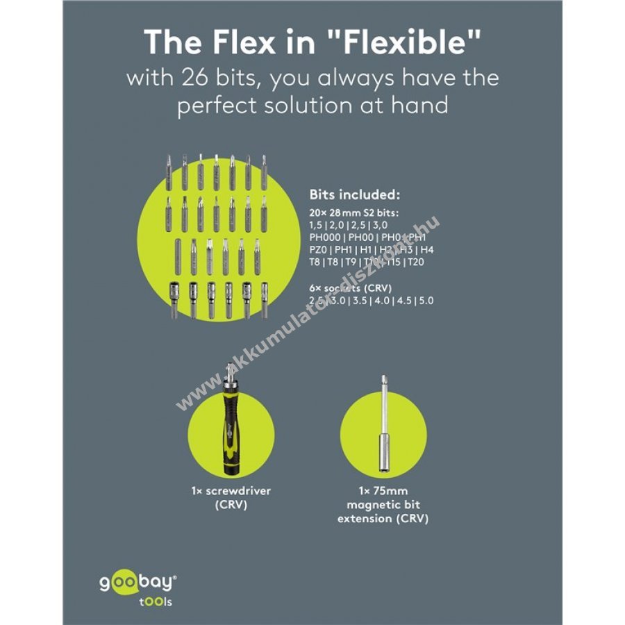 A készlet tartalmaz bittartó hosszabbítót 75 mm hosszban, 6 db CRV dugókulcsot 2,5-5 mm méretben és 20 ütésálló S2 acélból készült bitet 4 mm átmérővel.