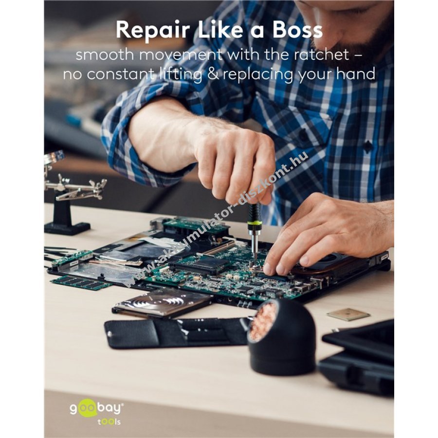 A gumi bevonatú fogantyú kényelmes fogást biztosít és precíz munkát tesz lehetővé okostelefonok, laptopok, PC-k és drónok javításánál.