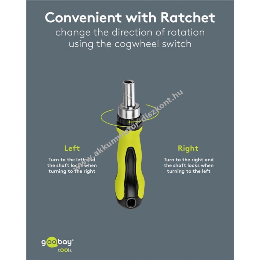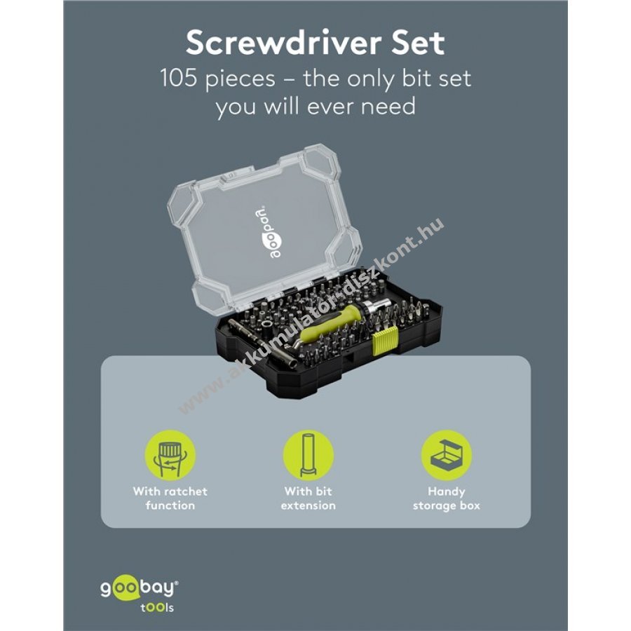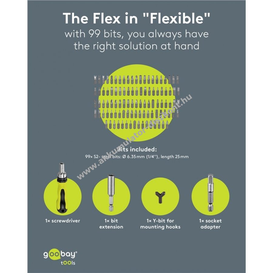 Tartozékok: 1/4 colos nyílás, 1 csavarhúzó adapter, 1 bit hosszabbító 60 mm, 1 csavarhúzó hosszabbító 50 mm, 1 racsnis adapter, 1 Y-bit kampók meghúzásához.