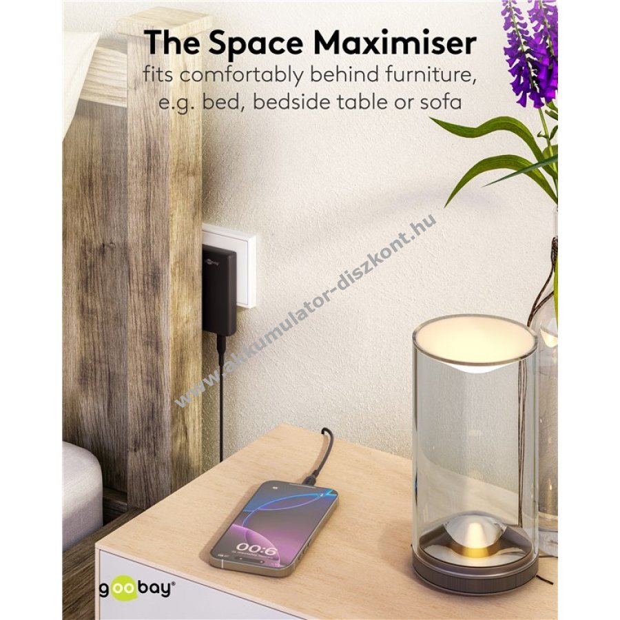 Az innovatív 90°-os kialakítás és az alul elhelyezett portok révén a töltő rendkívül helytakarékos.