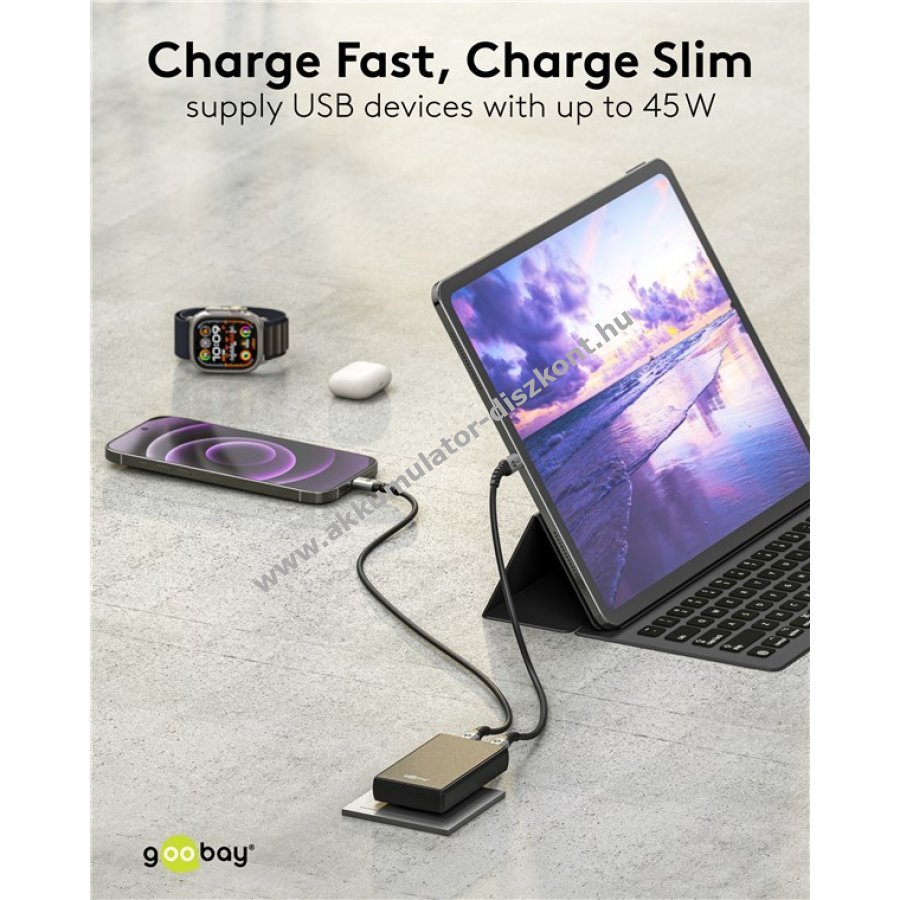 A 45 W teljesítményű USB-C PD töltő számos eszközt képes ellátni energiával okostelefontól a kisebb notebookokig.