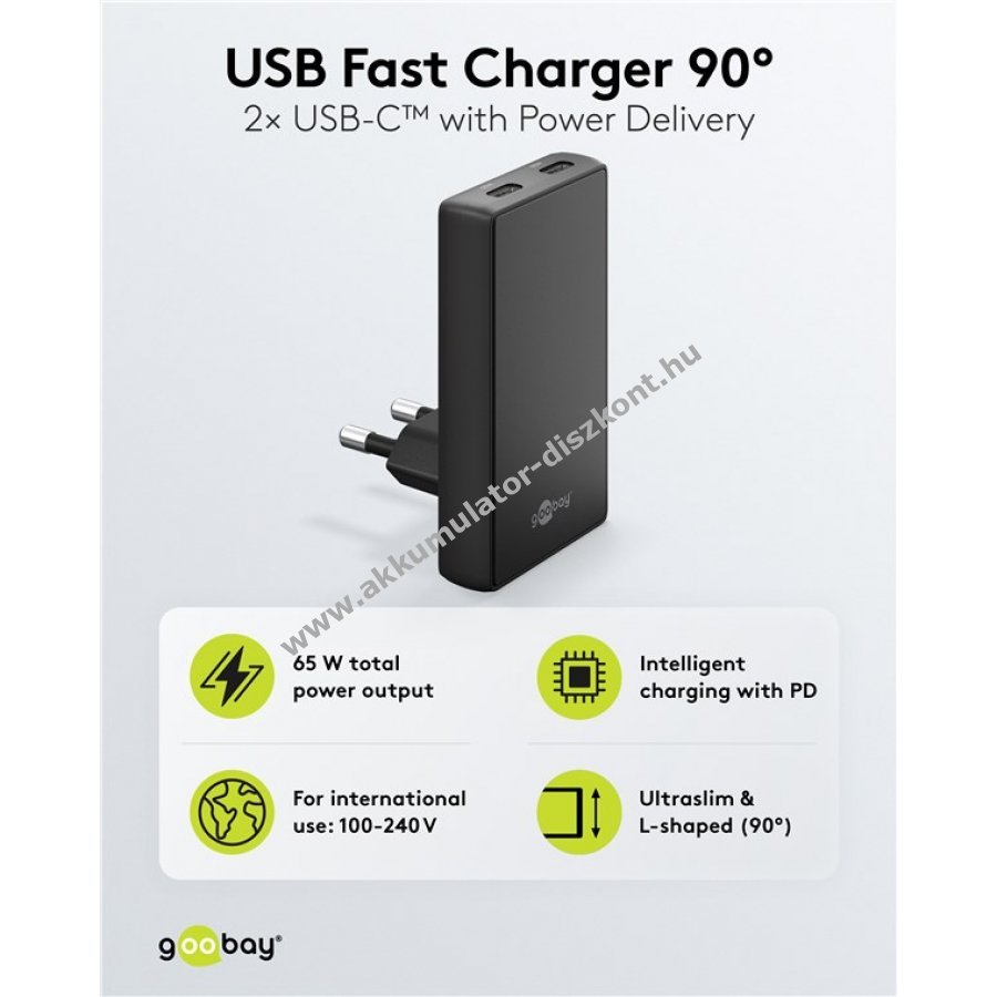 Goobay USB-C PD GaN 65W 2x USB-C gyors töltő 90° fekete