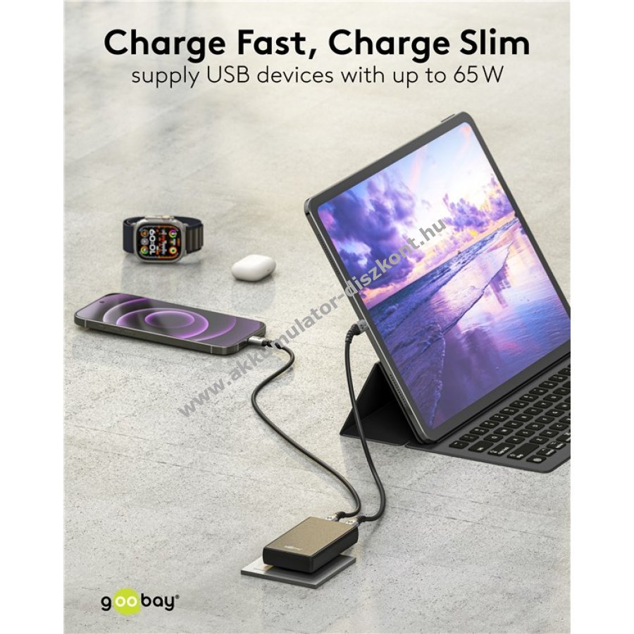 GaN félvezető technológiával gyorsabb és hatékonyabb töltést biztosít kisebb méretben.