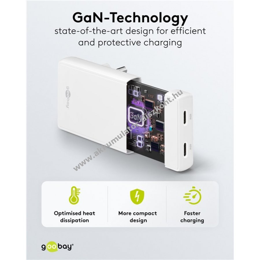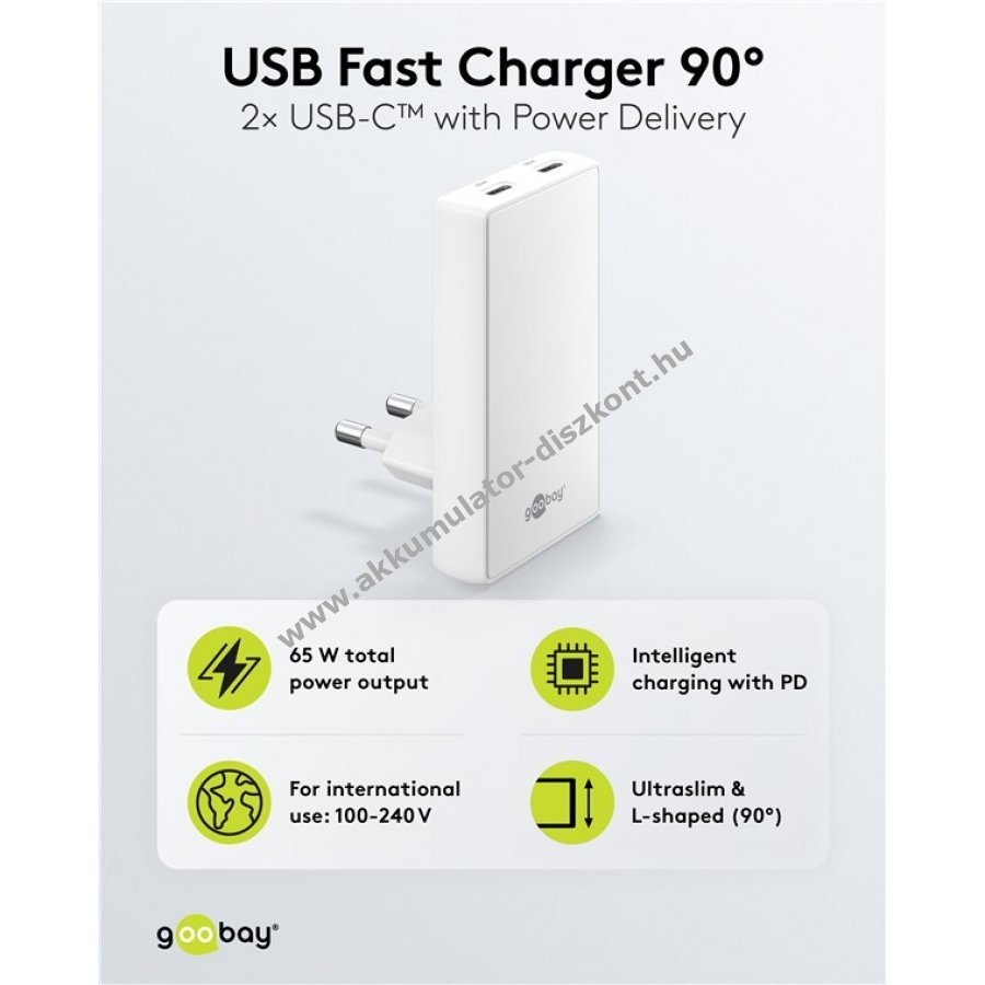 Innovatív 90°-os kialakításával és alul elhelyezett portjaival ez a töltő rendkívül helytakarékos. Ultravékony, így kényelmesen elfér bútorok mögött, például éjjeliszekrény, ágy, komód vagy kanapé mögött. A kábelek szorosan a fal mellett futnak, védi őket a töréstől. 65W teljesítményével és univerzális USB-C csatlakozójával szinte minden eszközt képes tölteni okostelefontól a nagy teljesítményű notebookig. A GaN félvezető technológia gyorsabb és hatékonyabb töltést biztosít, miközben kisebb és könnyebb a hagyományos töltőknél. Power Delivery funkcióval dinamikusan állítja be a töltőteljesítményt az eszköz igényei szerint. Két USB-C porttal rendelkezik, így utazáshoz is ideális egyetlen adapterrel. Kompatibilis Apple iPhone, Samsung, Xiaomi, LG, Huawei okostelefonokkal és Apple iPad, Samsung Galaxy táblagépekkel. Beépített védelemmel rendelkezik túláram, túltöltés és túlmelegedés ellen.