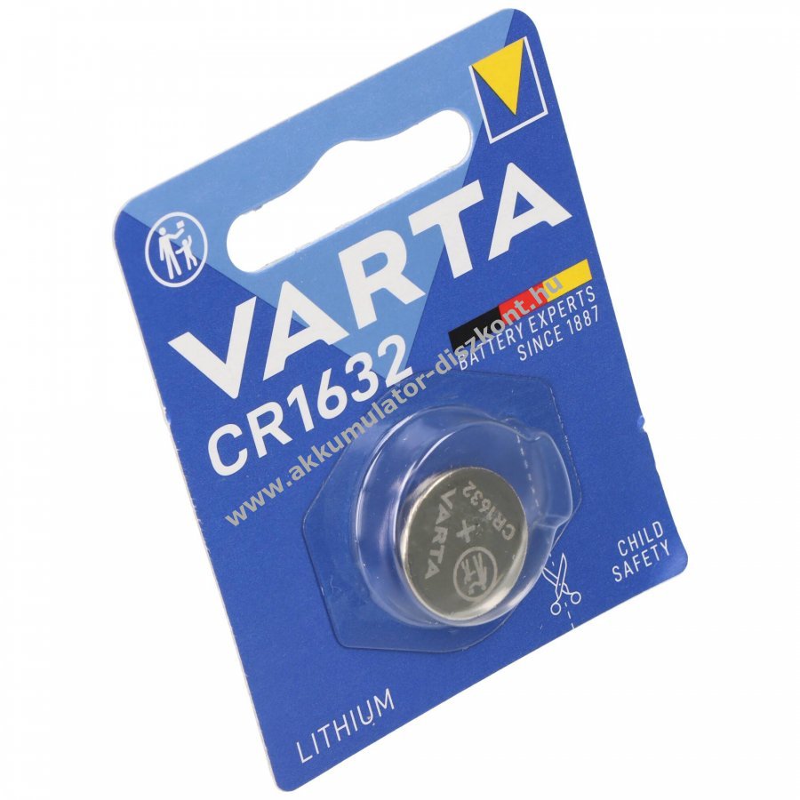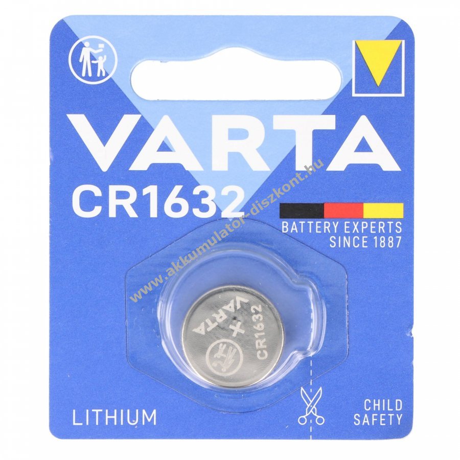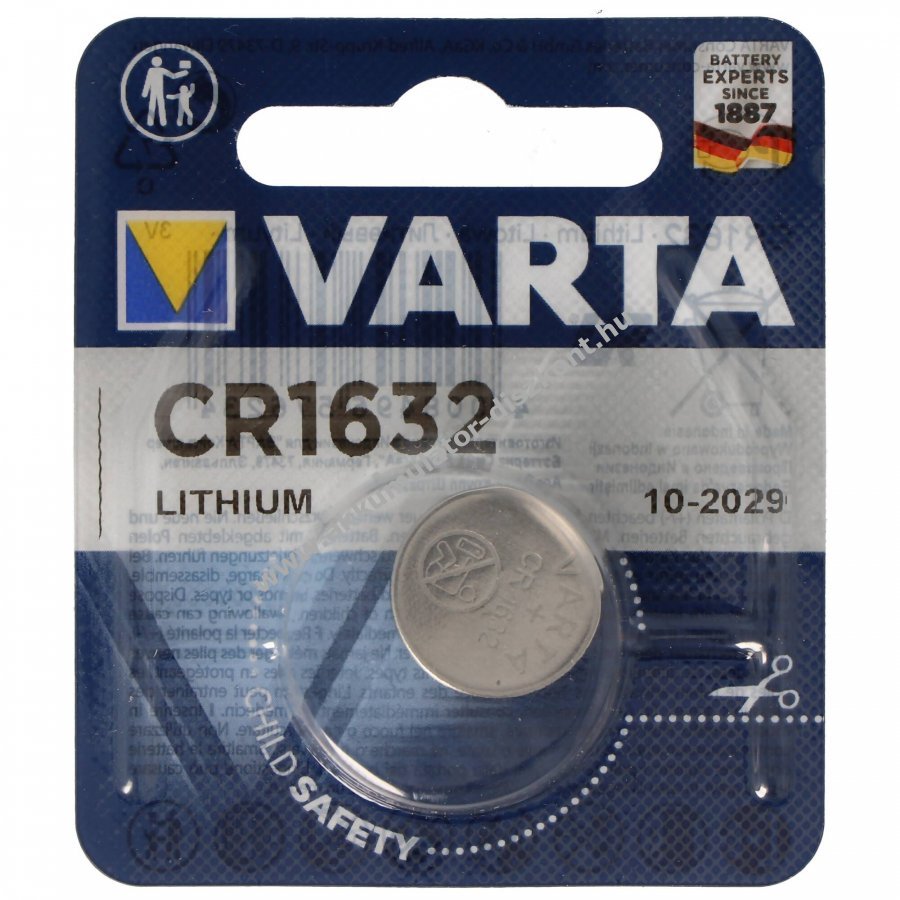 Varta CR1632 lítium gombelem 3V 140mAh. Egyszer használatos, kerek CR1632 méretű elem, kis tömegű és kompakt kialakítású. Gyártói cikkszám: 06632101401.