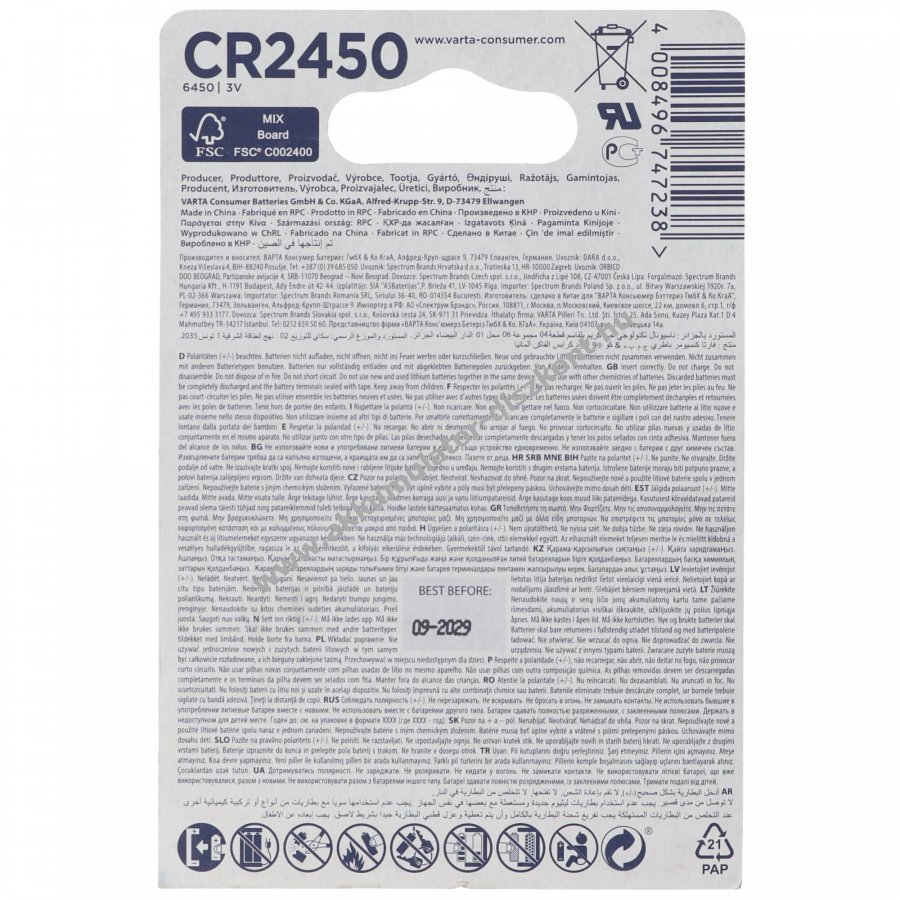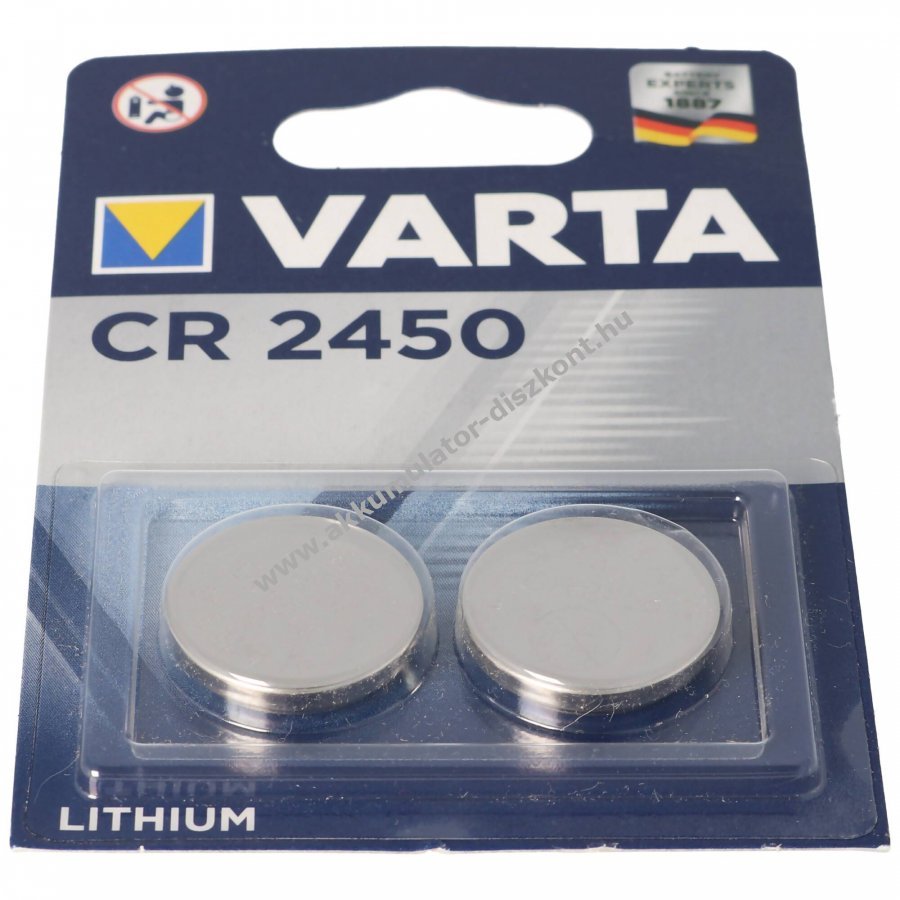 Varta CR2450 lítium gombelem, egyszer használatos, 2db/csomag.