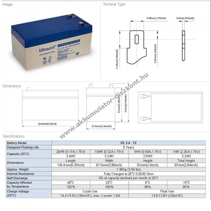 Ultracell ólom Akkumulátor 12V 3.4Ah