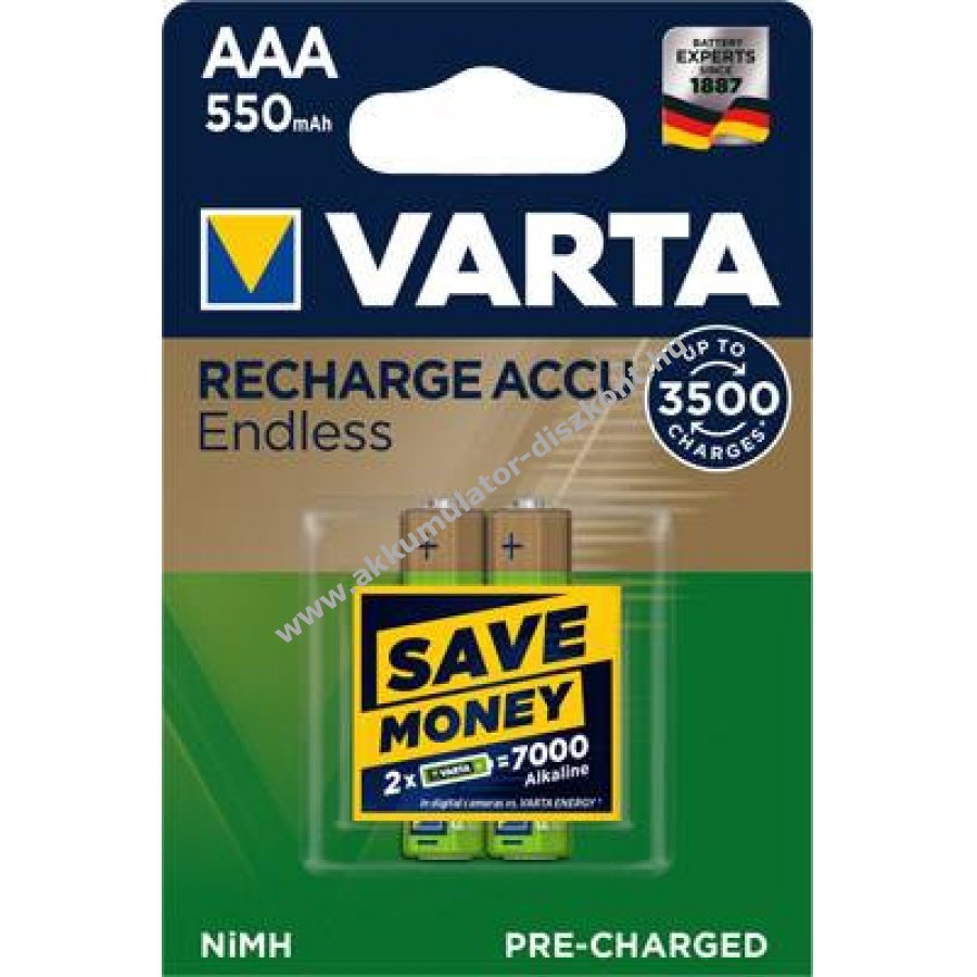 Varta Recharge Accu Endless AAA (Micro) akku 1,2V 550mAh, előtöltve és rendkívül alacsony önkisüléssel, akár 3500 töltési ciklusig.