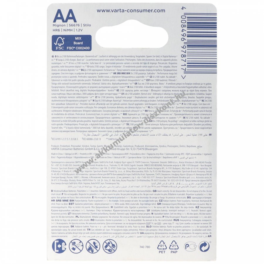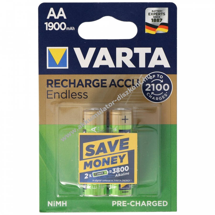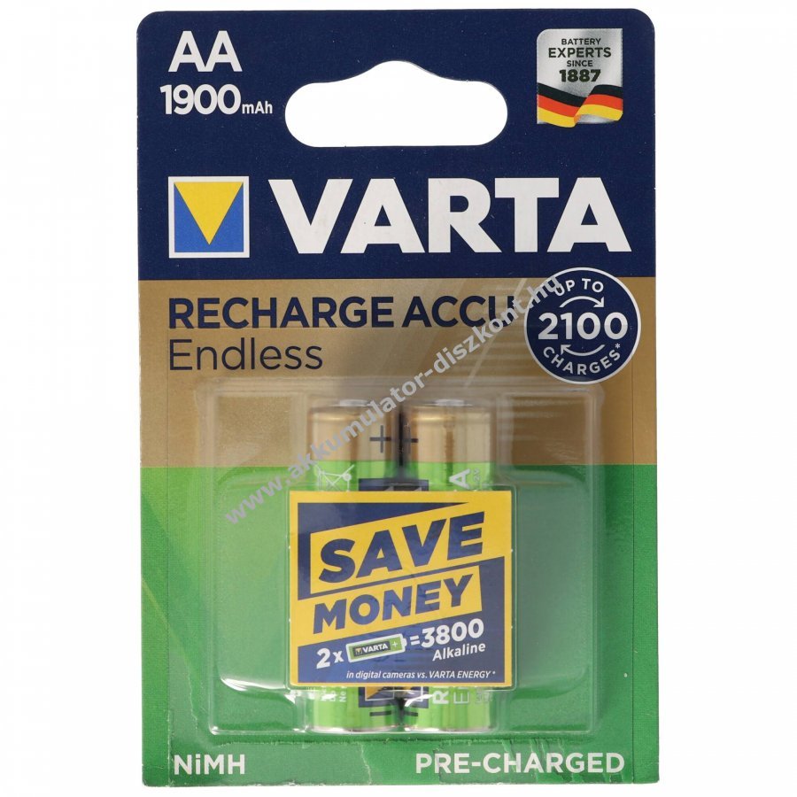 Újratölthető Varta Recharge Accu Endless NiMH AA (Mignon ceruza) akkumulátor 1900mAh, akár 2100-szor feltölthető, 2db/csomag