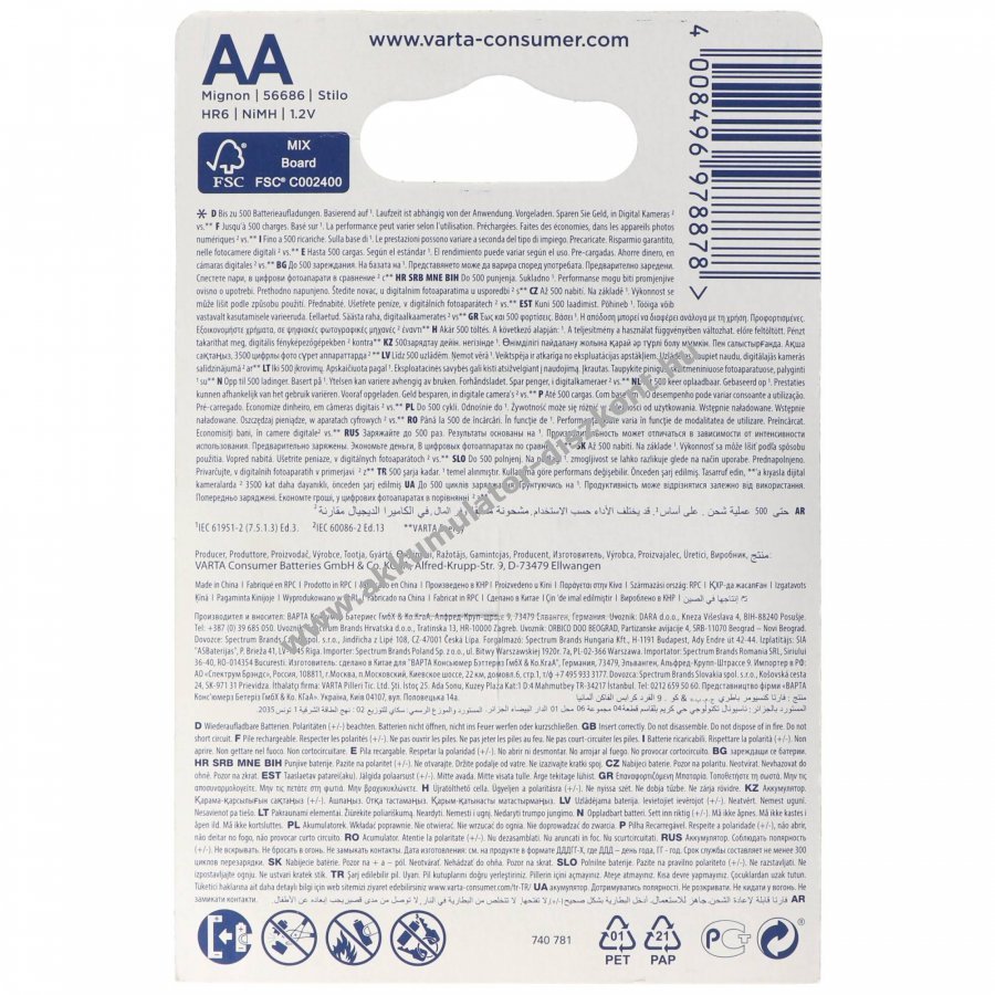 Varta Recharge Endless AA Mignon ceruza NiMH újratölthető akku, speciálisan az energiatakarékos és nagy energiaigényű készülékek követelményeihez fejlesztve. Nagyon alacsony önkisülésének köszönhetően hosszabb tárolás után is azonnal használható. Akár 500 töltési ciklus élettartamával megbízható választás különböző alkalmazásokhoz.