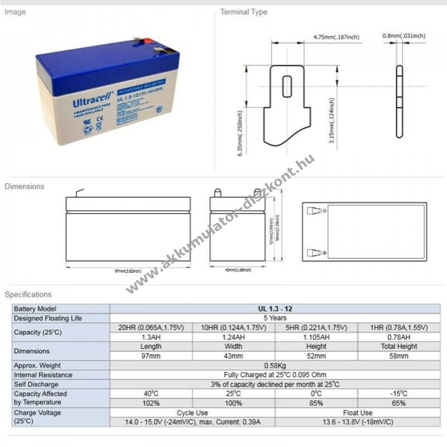 12V 1300mAh/15.6Wh Pb 97mm Ultracell