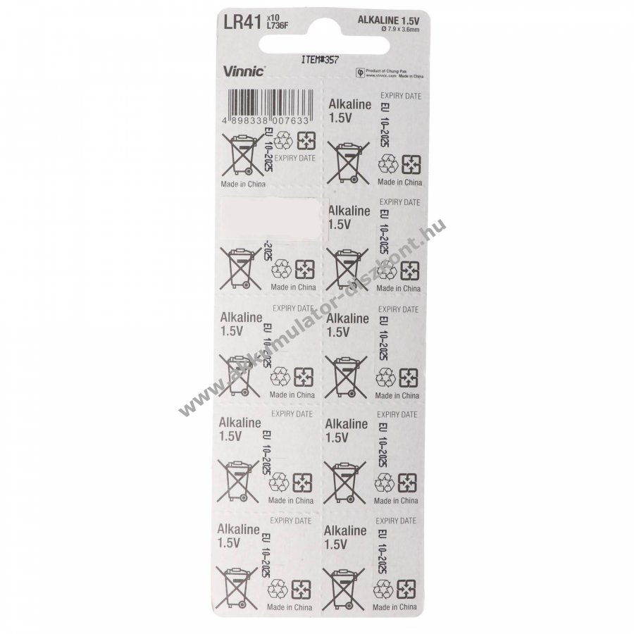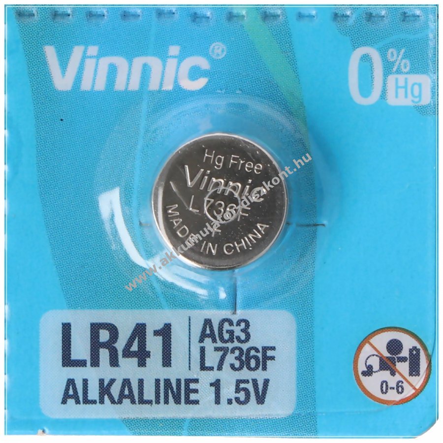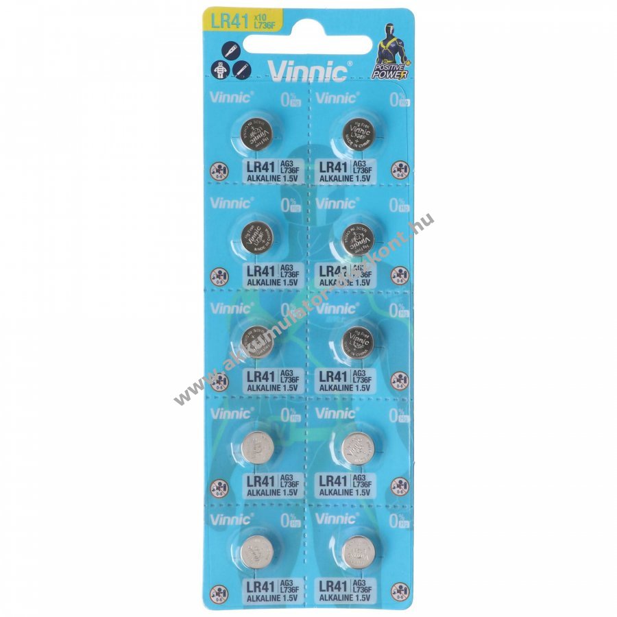 Vinnic 10db-os AG3 (LR41, L736F) alkáli gombelem készlet, friss gyártású elemek akár 5 év szavatossággal. Gazdaságos választás mindennapi kis elektronikai eszközökhöz tartós vagy nagy pontosságot igénylő óraszereléshez inkább 1,55V ezüst-oxid (pl. Varta V377) javasolt.