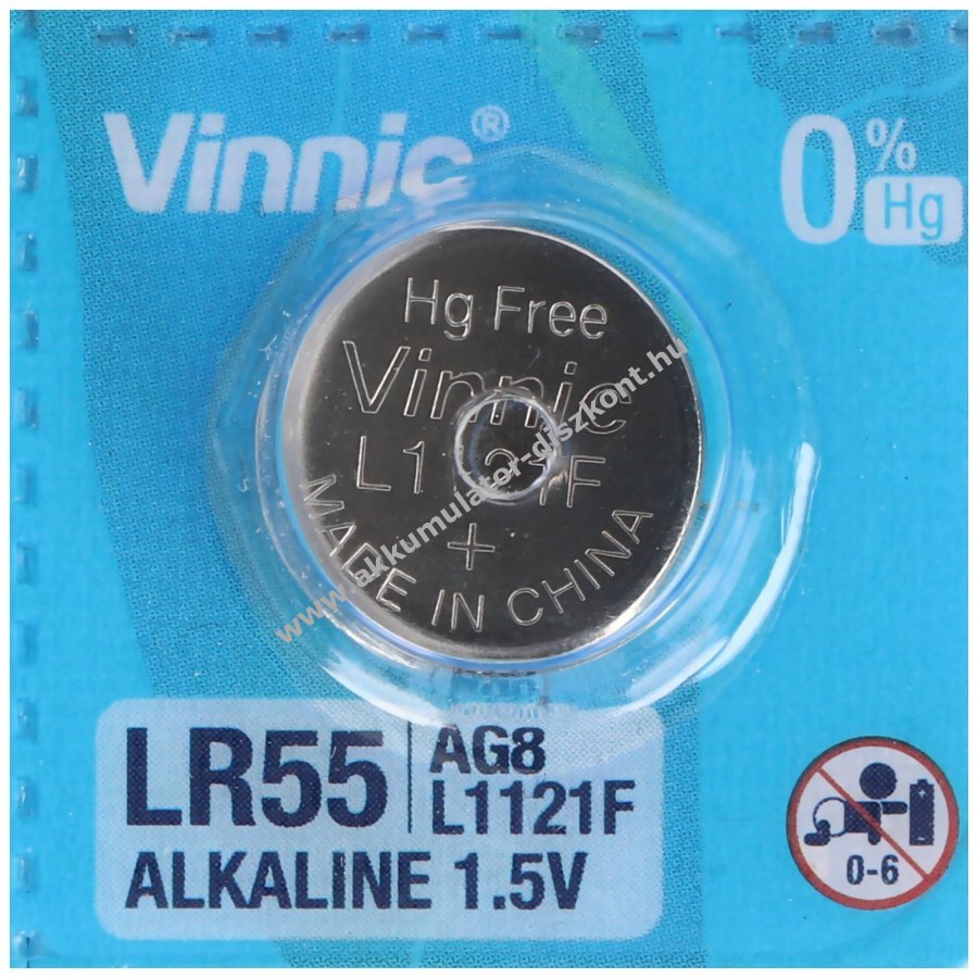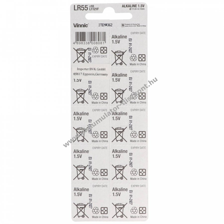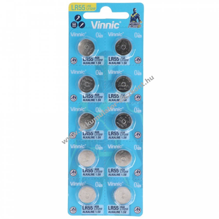 VINNIC LR55 alkáli gombelem, 10db/csomag. Alacsony önkisülésű, egyszer használatos alkáli elem játékokhoz és kis elektronikai eszközökhöz nem ajánlott órákhoz, ahol 1,5V ezüst-oxid elem a jobb választás.