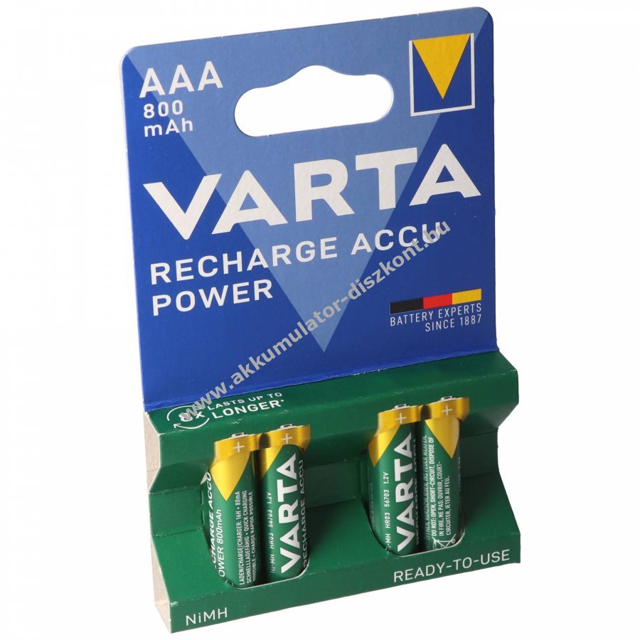 VARTA Ready2use előtöltött újratölthető AAA (mikro) akkuk, azonnal használhatók. 800mAh kapacitás, 1,2V feszültség, 4db/csomag. Modell: 56703.