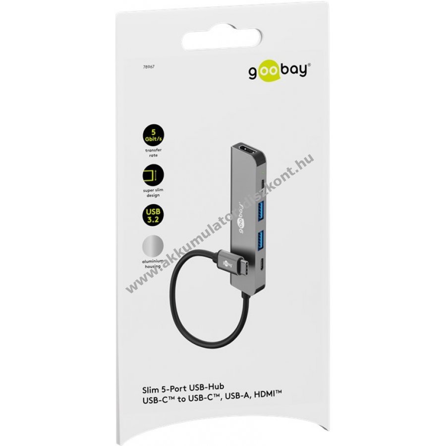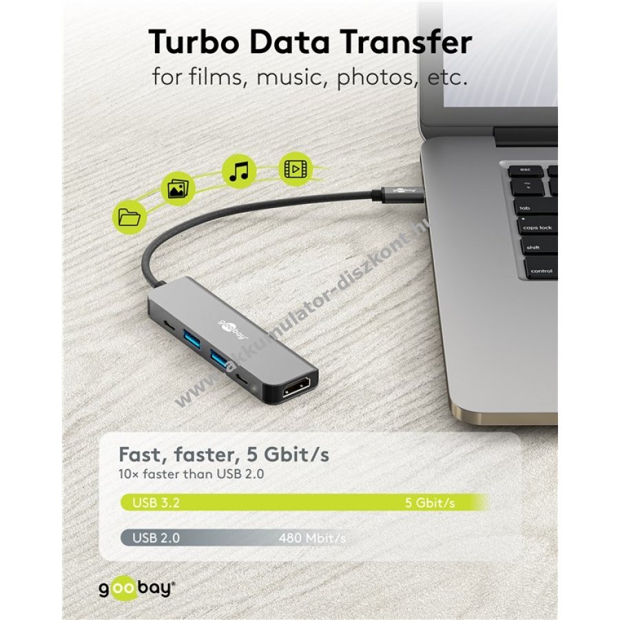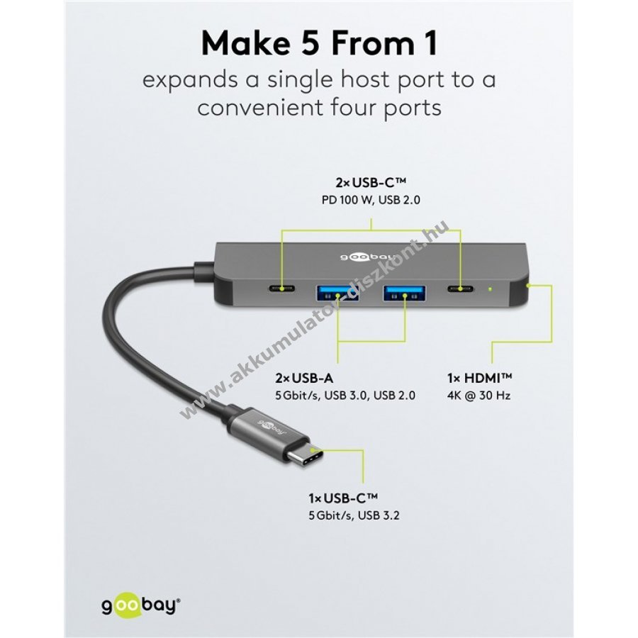 Egy USB-C csatlakozót bővít öt portra és egy HDMI kimenettel rendelkezik.