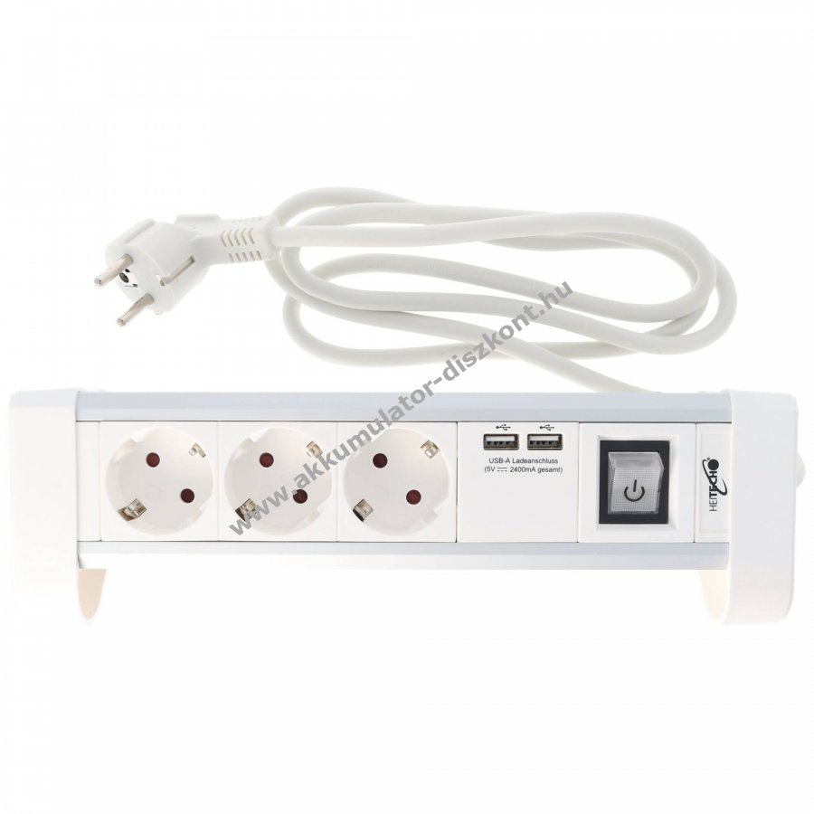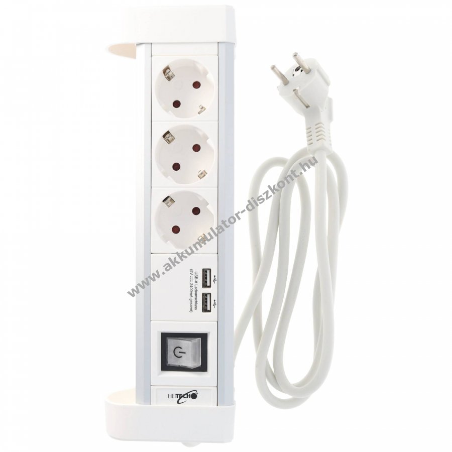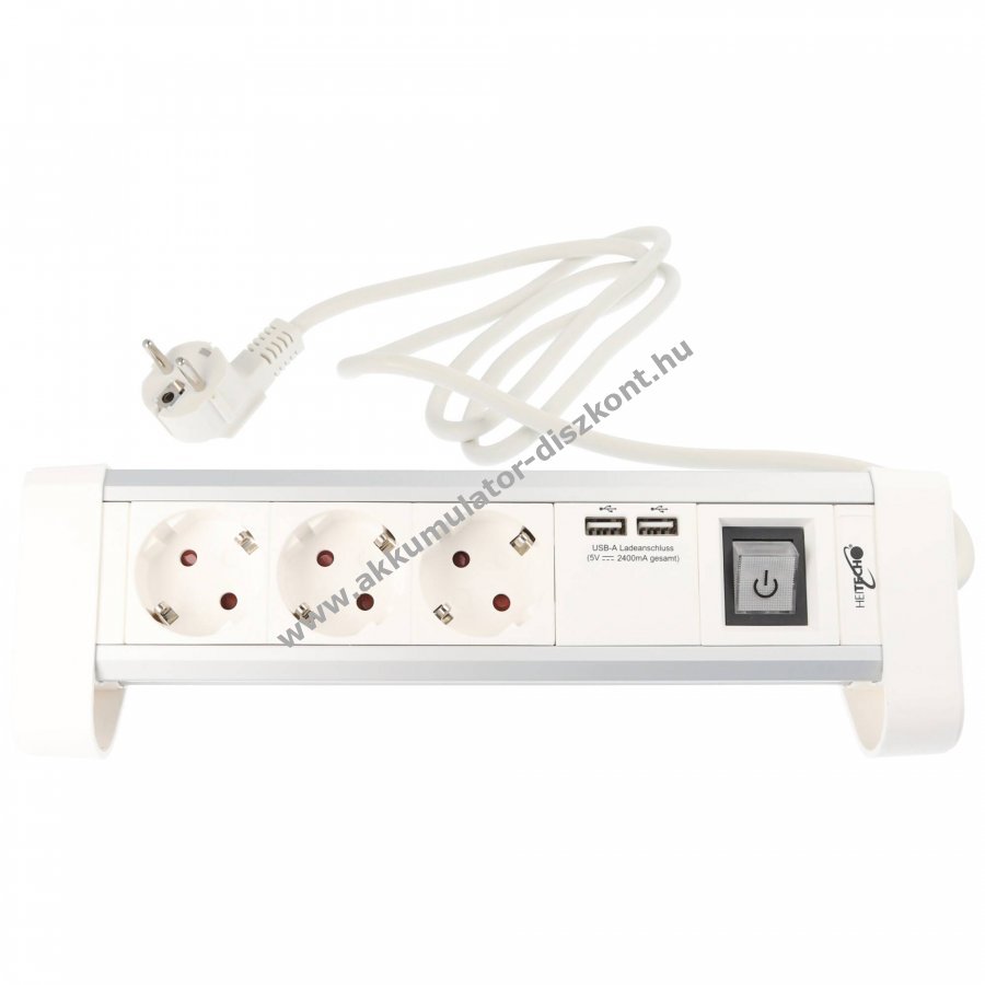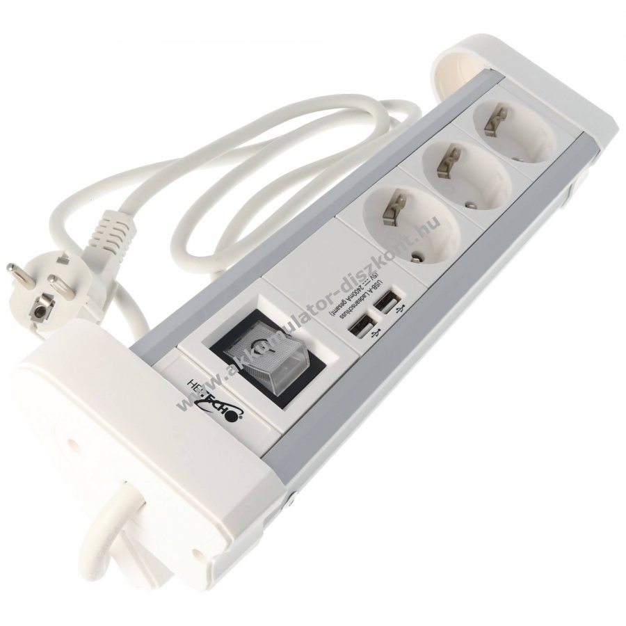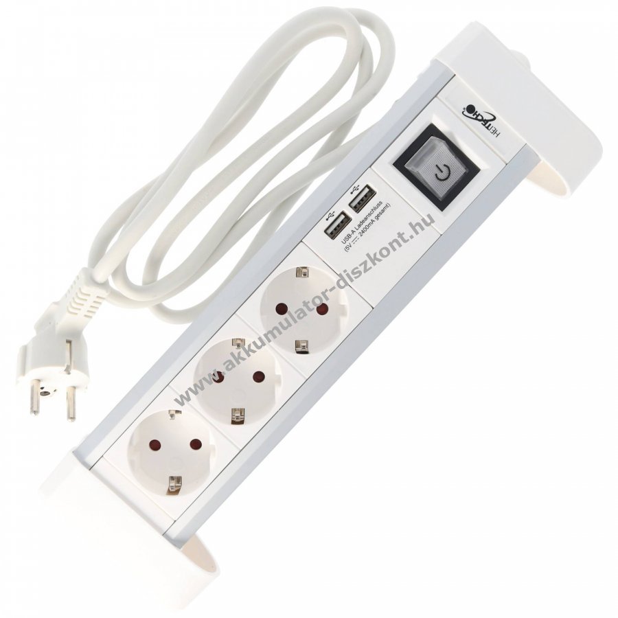 Heitech 3-foglalatos asztali elosztó alumíniumborítással, 2 integrált USB töltővel (5VDC, max.2000mA) és ergonomikus rögzítő lábbal. Ideális íróasztalra, munkapultra és konyhai kisegítő eszközökhöz.