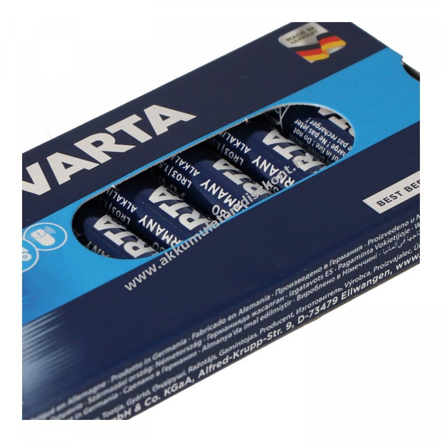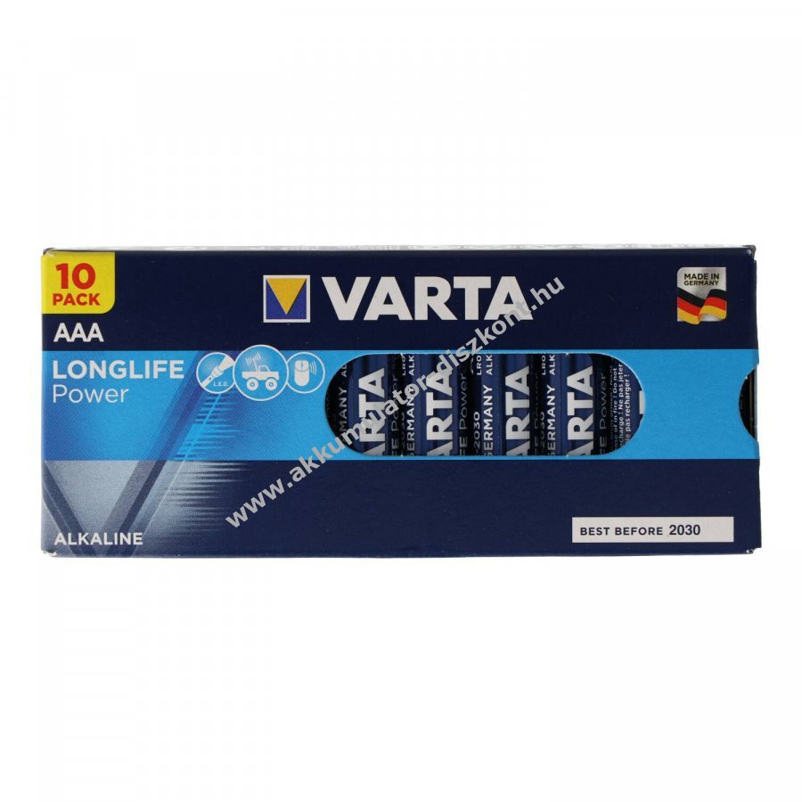 Varta Longlife Power (korábban High Energy) AAA (mikro) alkáli elem, kifejezetten energiaigényes készülékekhez, például játékokhoz, audioberendezésekhez, elektronikus játékokhoz és füstjelzőkhöz. A csomag 10db laza elem kartonban.