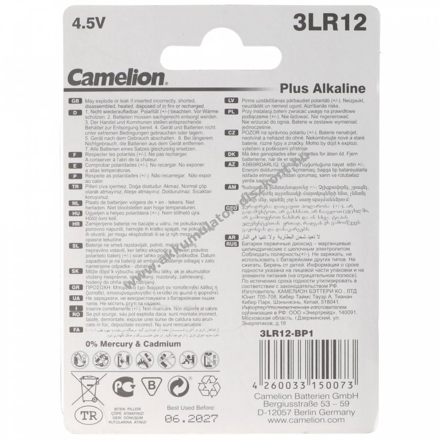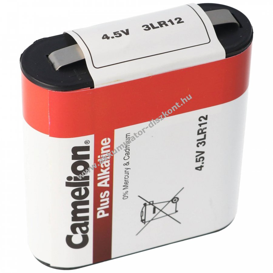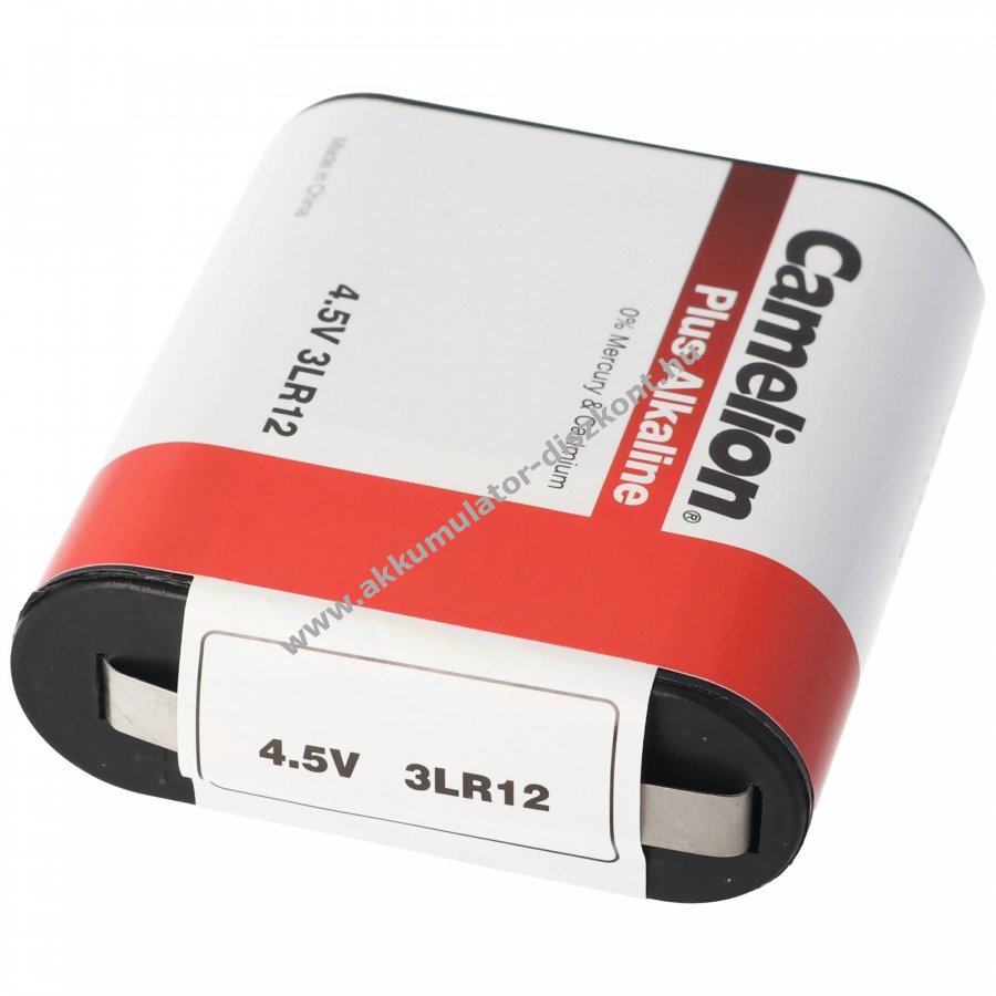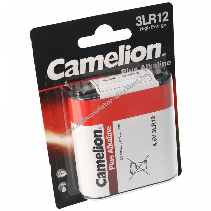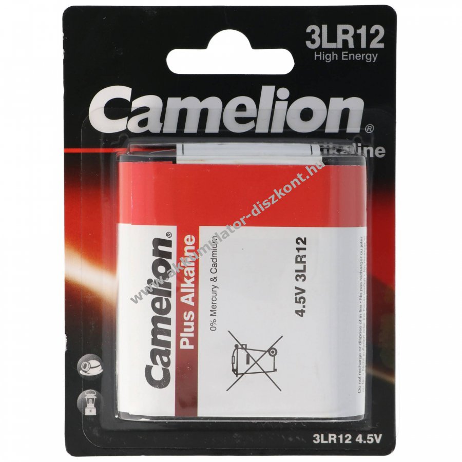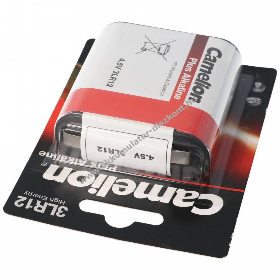 Camelion 3LR12 4,5V lapos elem, alkalmas alacsony és közepes fogyasztású készülékekhez különösen karácsonyi betlehemek világításához, zseblámpákhoz, játékokhoz és kísérleti készletekhez. Névleges feszültség 4,5V, kapacitás kb. 3000mAh méretek 65,0 x 61,5 x 21,5mm tömeg 83,0g burkolat papírmatrica.