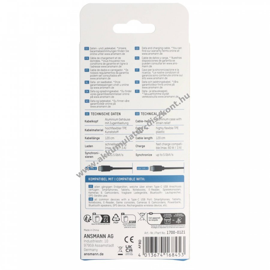 Ansmann USB-C adat- és töltőkábel 120 cm