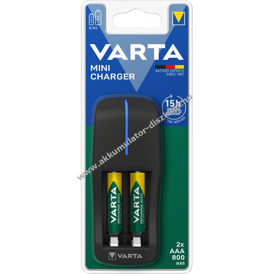 Kompakt Varta univerzális mini töltő, közvetlen hálózati csatlakozással támogatja az AAA (mikro) és AA (Mignon ceruza) NiMH akkukat. A csomagban két 800mAh kapacitású AAA (mikro) akku található.