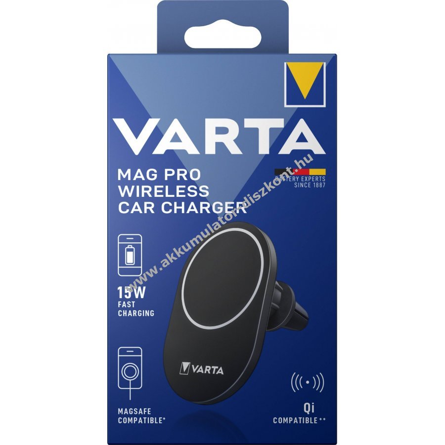Varta Fast Wireless autós vezeték nélküli töltő, kompatibilis az Apple MagSafe technológiával és Qi szabvánnyal, akár 15W vezeték nélküli töltési teljesítménnyel, puha anyagokkal a készülék védelmére, fehér LED státuszjelzéssel a csomagban USB-C-C kábel 1m és szellőzőrács rögzítő.