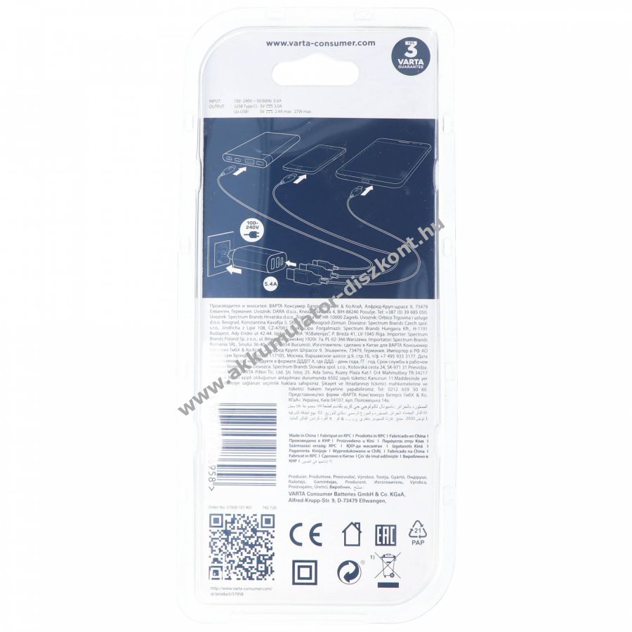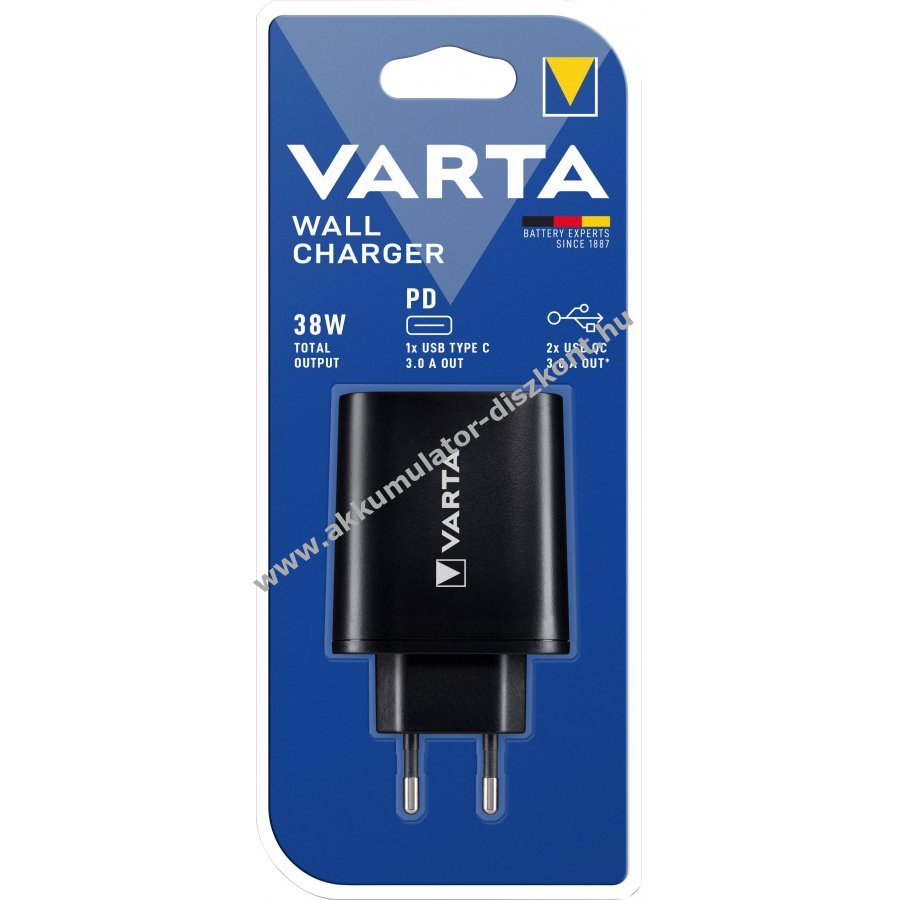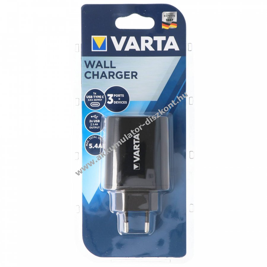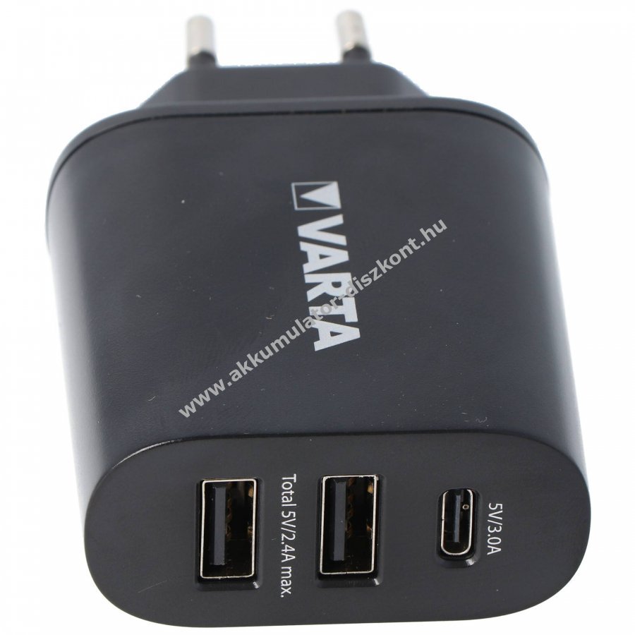 Varta USB falitöltő, fekete. Bedugható hagyományos konnektorba és USB-C vagy USB-A kábellel csatlakozó készülékekkel használható a kábelek nem tartozékok. Legfeljebb három eszköz tölthető egyszerre, összesen max 27W teljesítménnyel.
