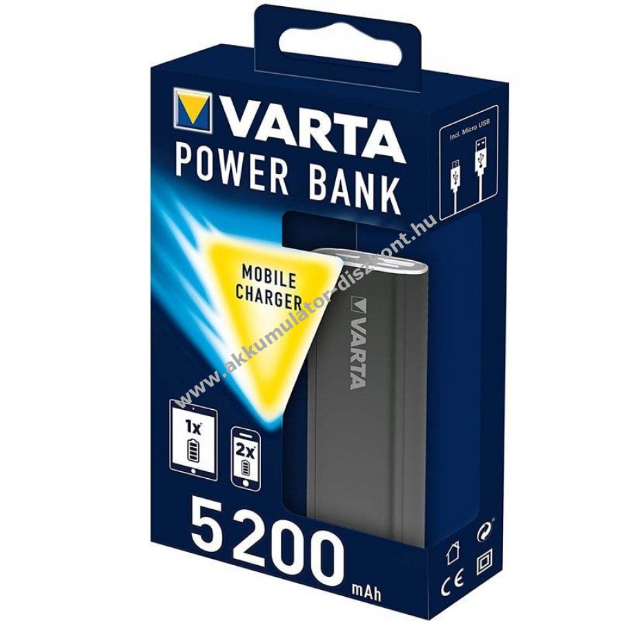 Kompakt Varta powerbank 5200mAh kapacitással, Li-Ion cellával, 4LED töltésjelzővel és tartozék Micro USB kábellel.