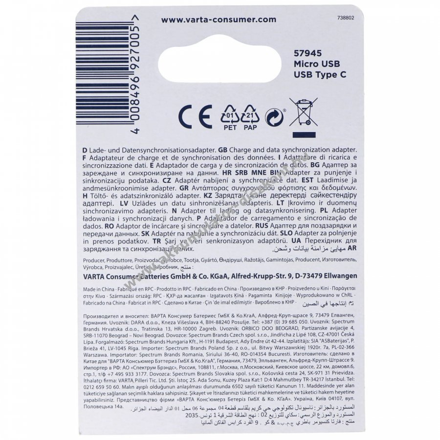 Varta Micro-USB adapter Micro-USB USB Type C 3A