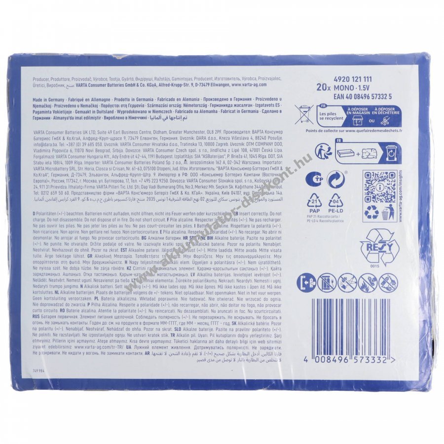 Varta Longlife Power D (góliát) 1,5V alkalin-mangán elem, erős, energiaigényes készülékekhez akár 10 évig tárolható.