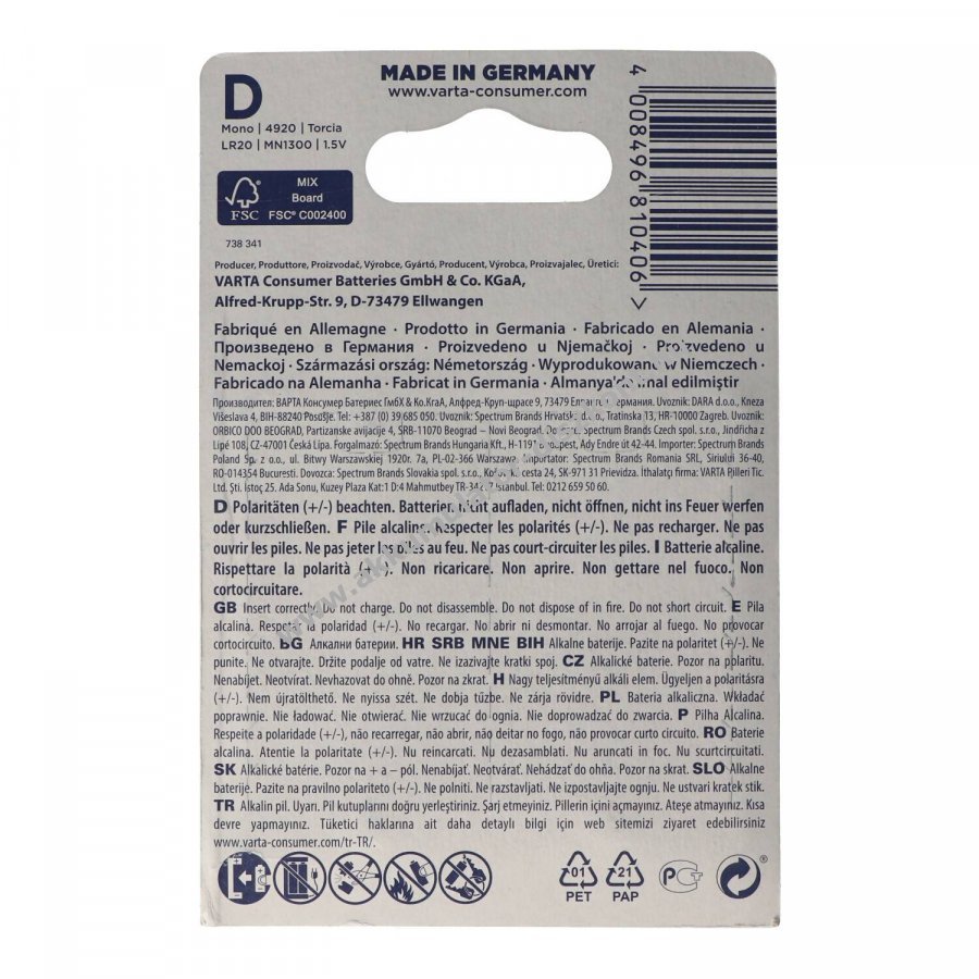 Varta Longlife Power (ehem. High Energy) D (góliát) elem nagy kapacitású, hosszú élettartamú, különösen energiaigényes alkalmazásokhoz alkalmas.