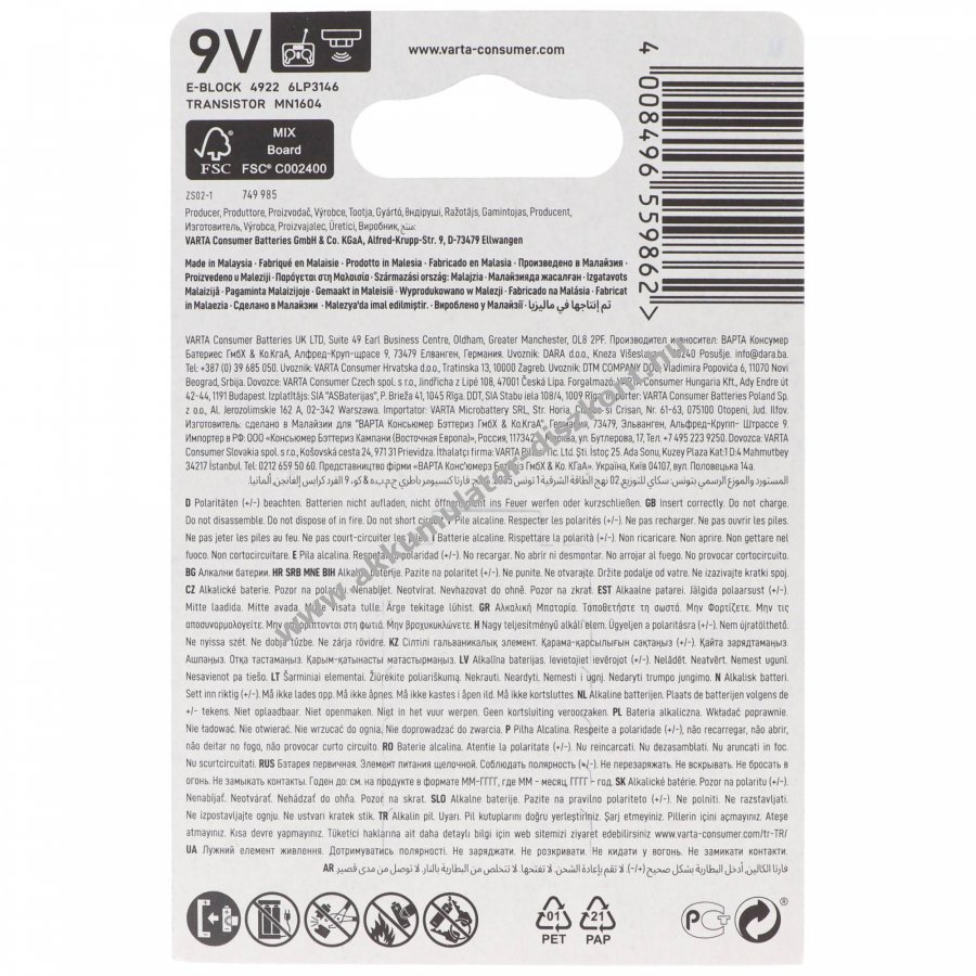- Típusok: E-Block 4922, 6LR61, 522, GP1604A, 6LF22, MN1604