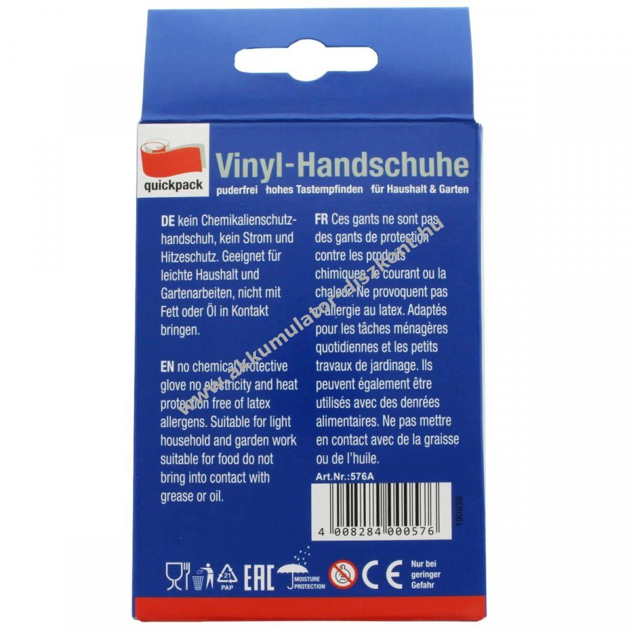 Fehér, púdermentes vinyl kesztyűk, 10db/csomag, méret M. Kiváló tapintásérzékenységet biztosít könnyű háztartási, hobbi és kerti munkákhoz. Nem vegyszerálló, nem nyújt védelmet áram vagy hő ellen. Cikkszám: 576A.
