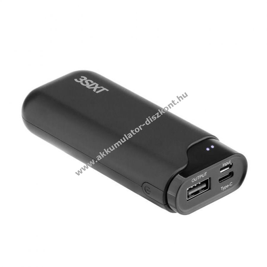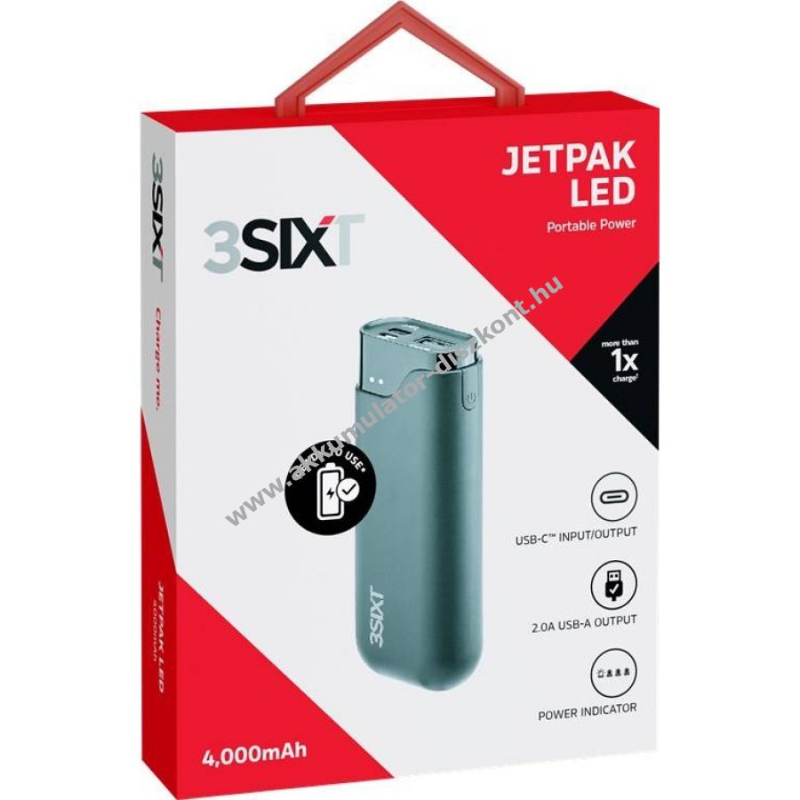 Kompakt 3sixT JetPak LED powerbank beépített LED akkumulátorjelzővel, USB-CT és USB-A csatlakozóval, 3,7V 4000mAh LiPo akkumulátorral.