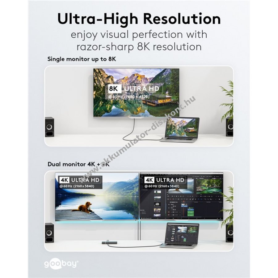 Nagysebességű adatátvitel és erős áramellátás egy kábelben. Az USB4 szabvány 40 Gbit/s adatátviteli sebességet és 100 W teljesítményt kínál. Ideális nagy teljesítményű laptopokhoz, Thunderbolt 4 dokkolókhoz és gyors NVMe meghajtókhoz. A 90°-os csatlakozó megakadályozza a kábel megtörését és helytakarékos elhelyezést tesz lehetővé. Támogatja az akár 8K @ 60 Hz illetve 4K @ 120 Hz felbontást egyetlen kijelzőn, illetve két 4K @ 60 Hz-es monitort hubon keresztül. HDR10 kompatibilis, így kiváló HD videó streaminghez külső kijelzőkre. Támogatja a DisplayPort 2.1 és PCIe 4.0 adatfolyamokat, valamint kompatibilis Thunderbolt 3 és 4 portokkal. Kiváló választás gamer és professzionális eszközökhöz.