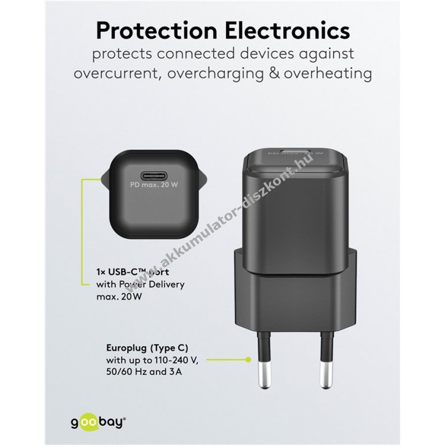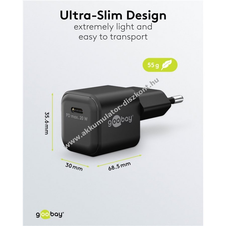 Kompakt és könnyű USB-C gyorstöltő 20 W teljesítménnyel okostelefonok, tabletek és powerbankok számára. 30 perc alatt 50% töltöttség a gyors töltési módnak köszönhetően ami akár négyszer gyorsabb a hagyományos töltőknél. GaN technológia biztosítja a hatékonyabb és gyorsabb töltést valamint kisebb méretet. Power Delivery funkcióval az optimális töltési teljesítmény automatikusan beállítódik az eszköz igényei szerint. Univerzális USB-C csatlakozó kompatibilis Apple iPhone Samsung Xiaomi LG Huawei készülékekkel és tabletekkel. Beépített védelem túláram túltöltés és túlmelegedés ellen.