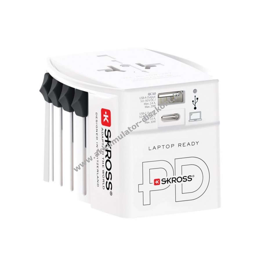 A Skross World Adapter MUV USB AC30PD lehetővé teszi egyszerre egy USB-C és egy hagyományos USB eszköz töltését miközben egy 2 pólusú, földelés nélküli készülék csatlakoztatható.