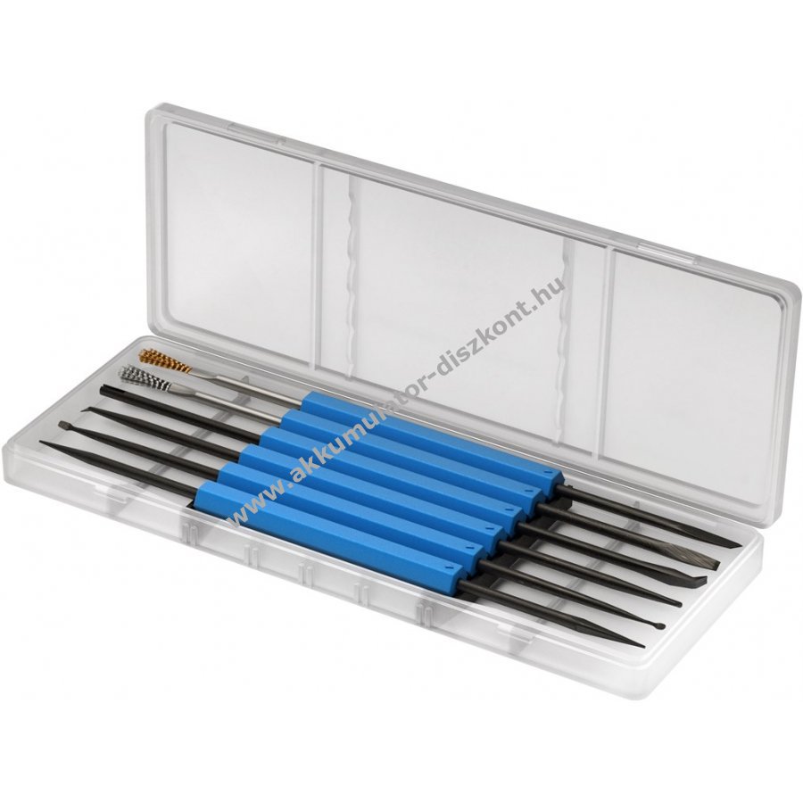 Tartalmaz 2 kefét laza részek eltávolításához 1 csavarhúzót 3 mm-es 1 vágószerszámot panelokhoz és szigeteléscsupaszításhoz 1 villát huzalok hajlításához és fogásához 2 chip tartót 1 kerek keresztmetszetű tisztító fúrót panellyukakhoz 1 emelőt és 1 kampót panelrészek kifeszítéséhez 2 hegyes kaparót korrózió eltávolításához.