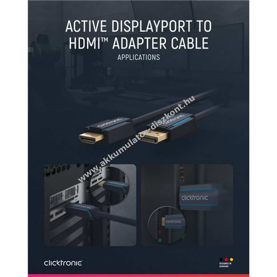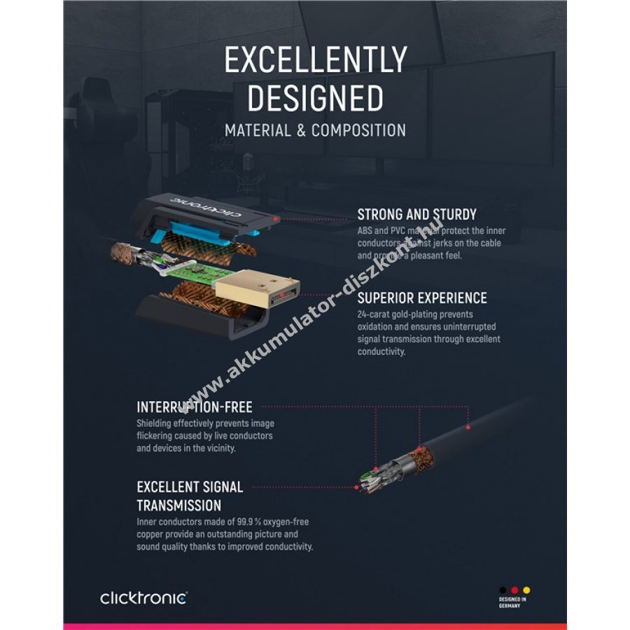 A Clicktronic aktív DisplayPort-HDMI adapterkábel kiváló minőségű anyagokból készült a hosszú élettartam és stabilitás érdekében. 10 év garancia biztosítja a megbízhatóságot. A háromrészes PVC és ABS csatlakozó kialakítás csökkenti a kábel sérülését húzás esetén. A 24 karátos aranyozott fém érintkezők és tiszta réz vezetők garantálják a kiváló hang- és képátvitelt a tökéletes otthoni mozi és játékélményhez.